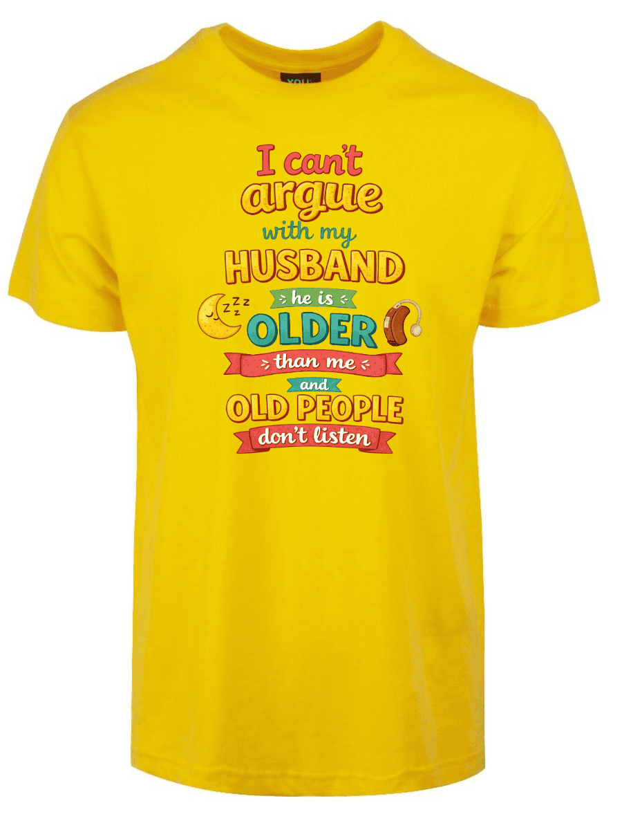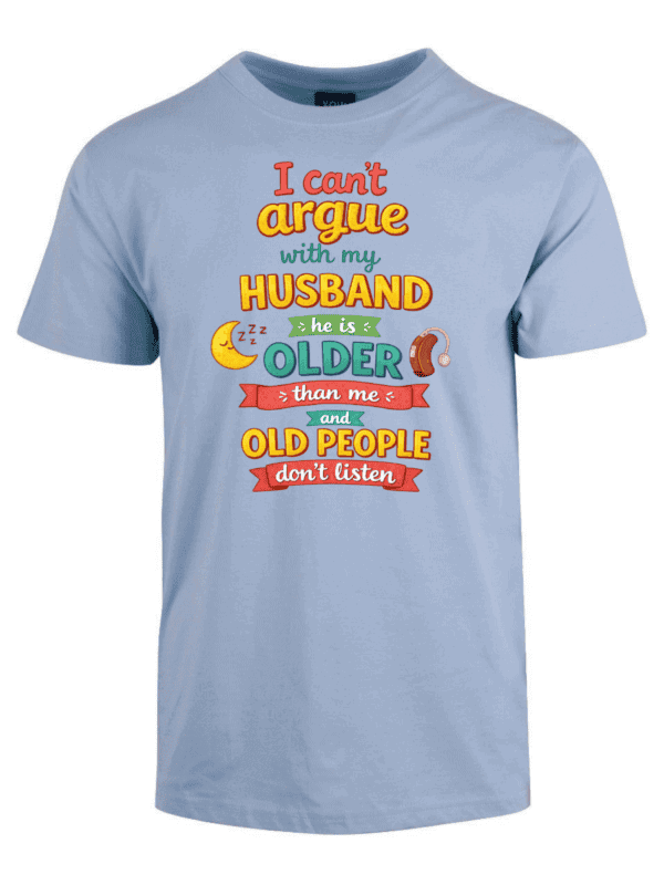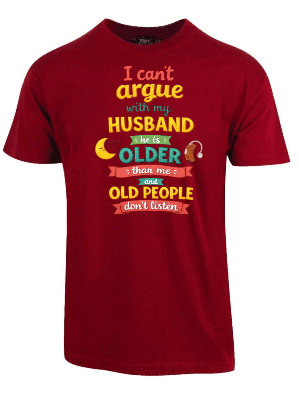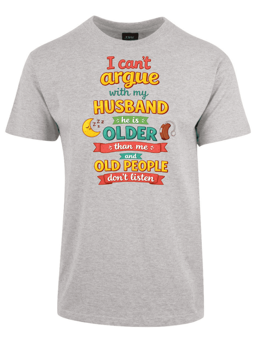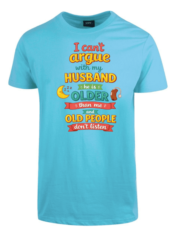 I cant argue with my husband er en t-skjorte med teksten «I cant argue with my husband he is older than me and old people dont listen». Ærlig observasjon om ekteskap med aldersforskjell.