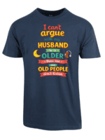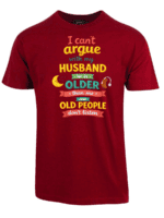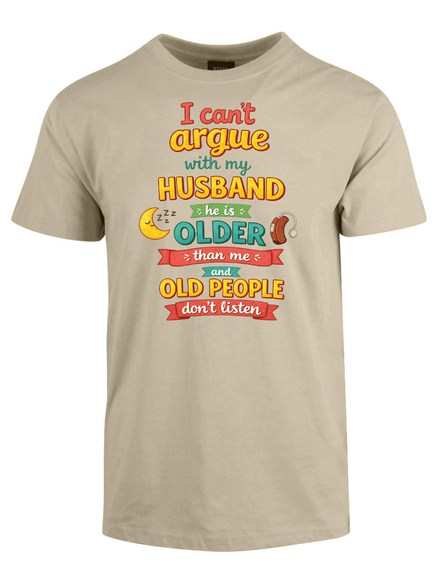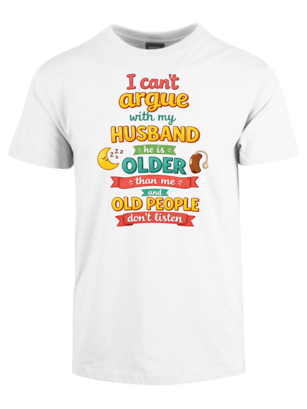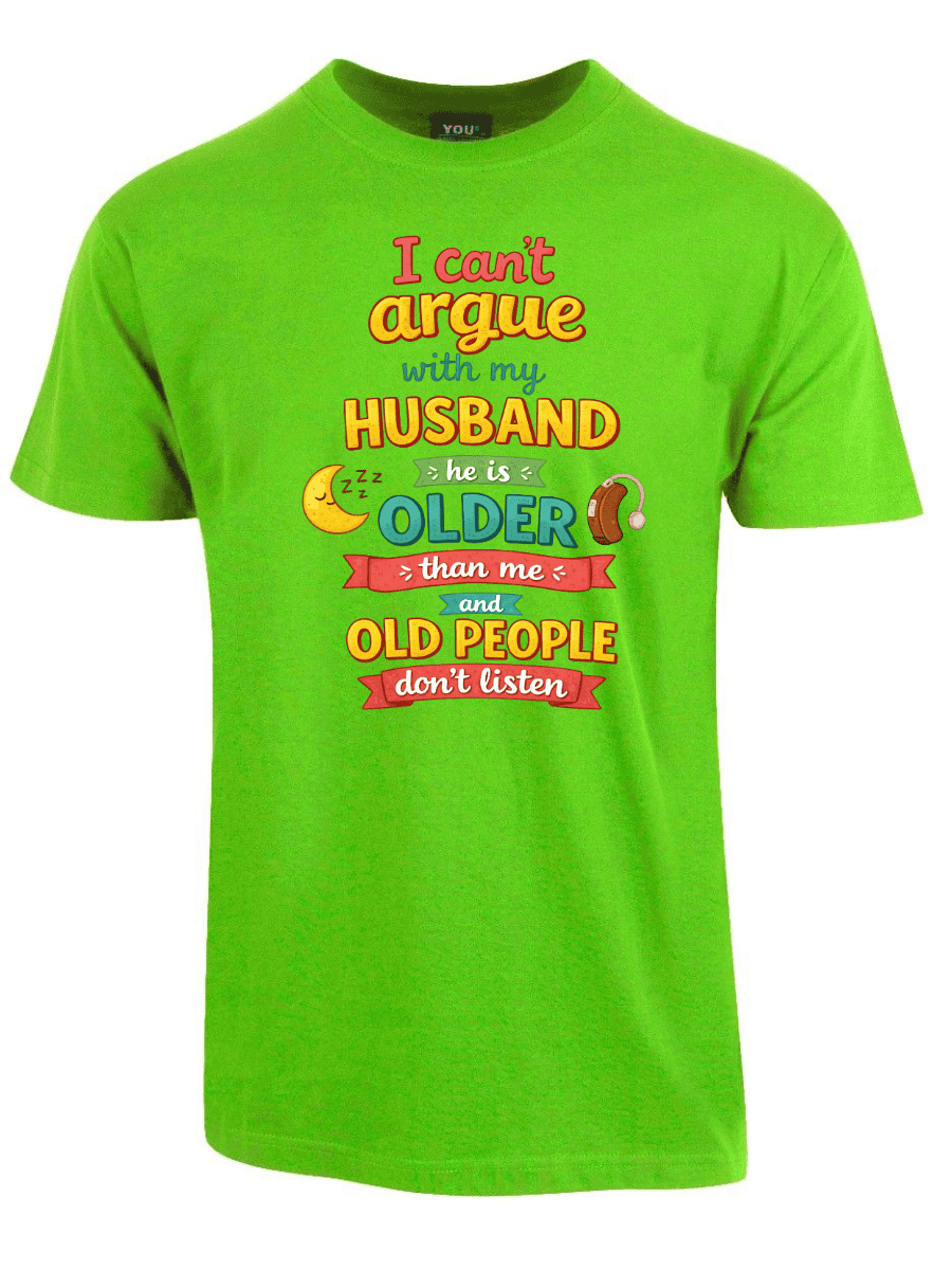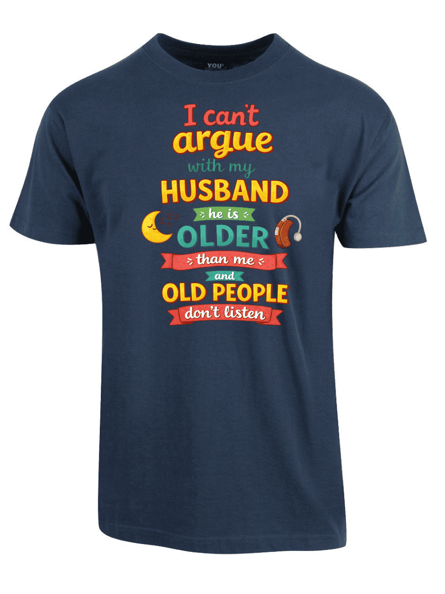 I cant argue with my husband er en t-skjorte med teksten «I cant argue with my husband he is older than me and old people dont listen». Ærlig observasjon om ekteskap med aldersforskjell.