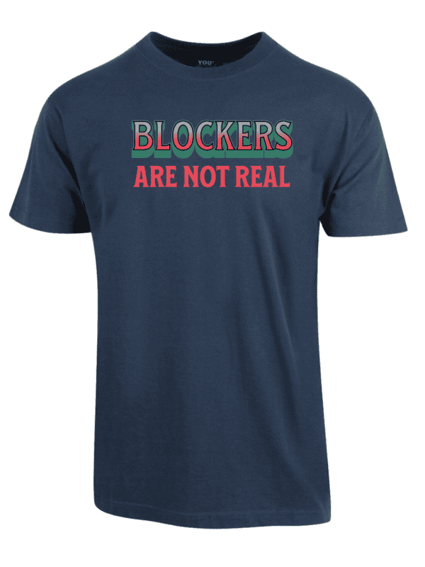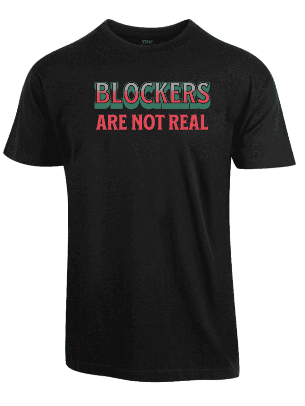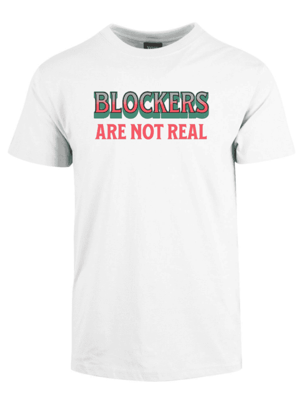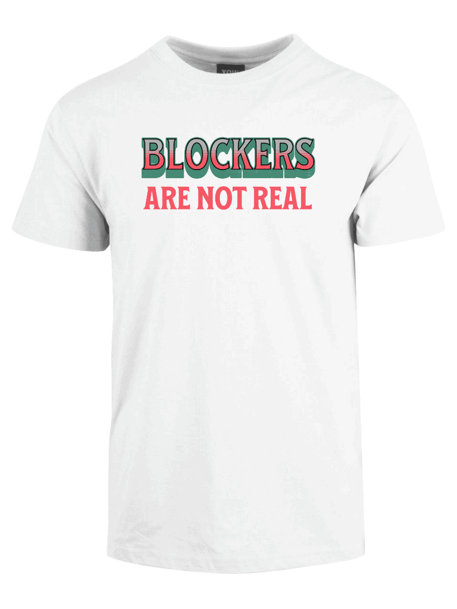 Blockers are not real er poker-filosofi destillert ned til fire ord. Du kan studere ranges, beregne kombinasjoner og argumentere for at villain umulig kan ha den hånden. Men bordet bryr seg ikke. Kortene ler av GTO-en din. Denne t-skjorten er for alle som har sittet med de perfekte A-blokkerne og sett motstanderen snu opp raketten uansett.