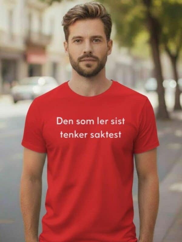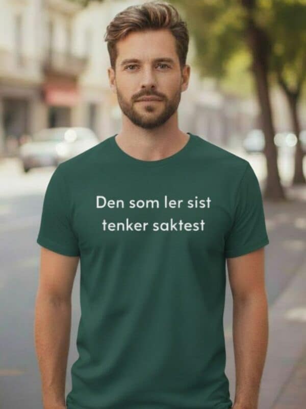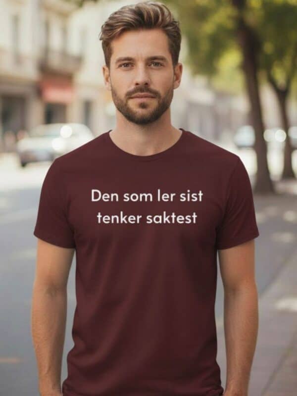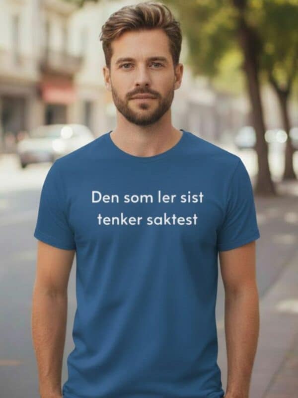Humoren fungerer fordi den spiller på et velkjent uttrykk og snur det på hodet. Mange har hørt “den som ler sist, ler best”, men her blir det til en morsom kommentar om treghet. Når du stiller i en T-skjorte med teksten «Den som ler sist tenker saktest», sender du et signal om at du både har glimt i øyet og setter pris på enkel hverdagskomedie. Den får folk til å reagere, enten med latter eller med et lite “den var faktisk god!”.