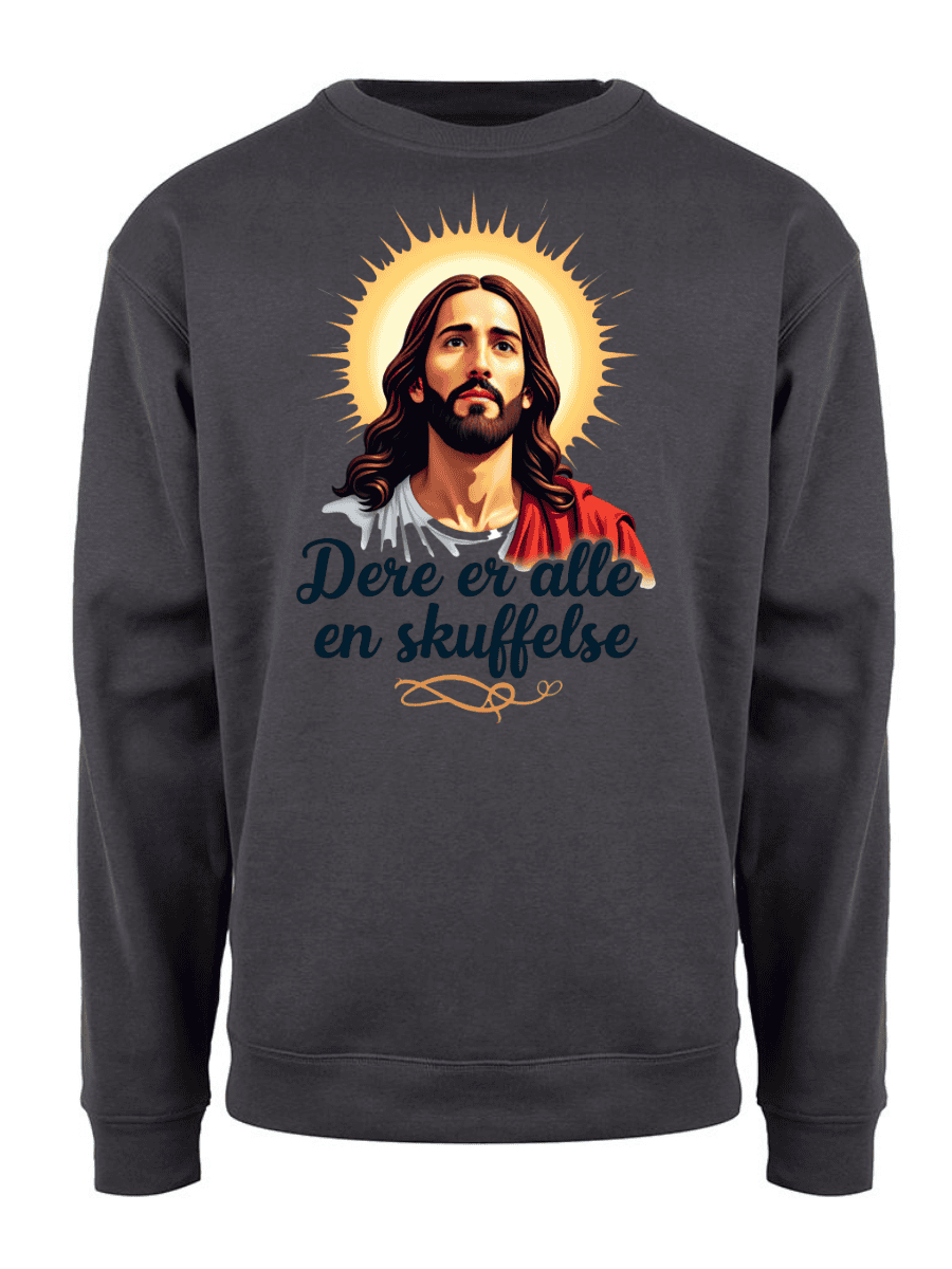 Forestill deg Jesus som ser ned på menneskeheten med en blanding av kjærlighet og… dyp skuffelse. Med vår «Dere er alle en skuffelse» collegegenser får du akkurat det – et ikonisk bilde av Jesus med teksten som sier det vi alle tenker av og til.
