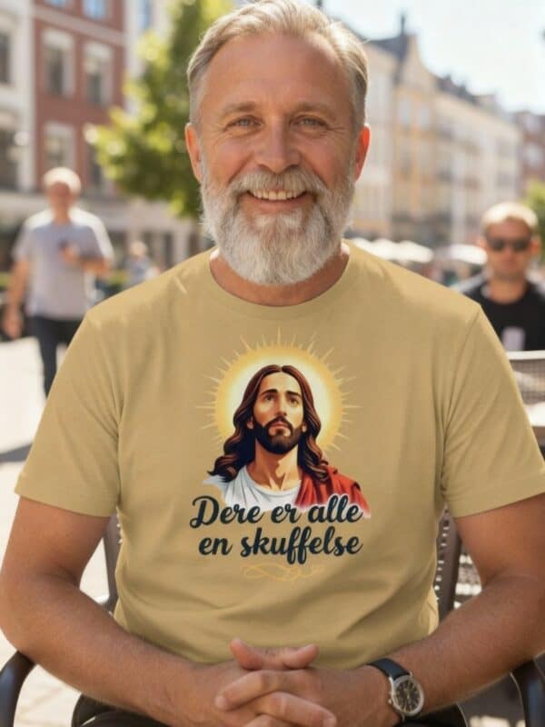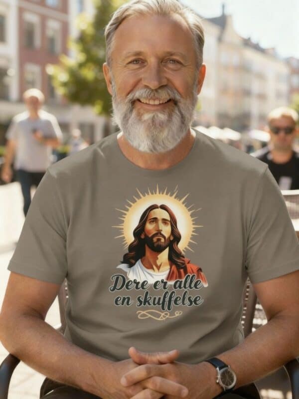 Denne T-skjorten har et bilde av Jesus som sier: «Dere er alle en skuffelse», noe som gir et snev av humor og ironi til garderoben din.