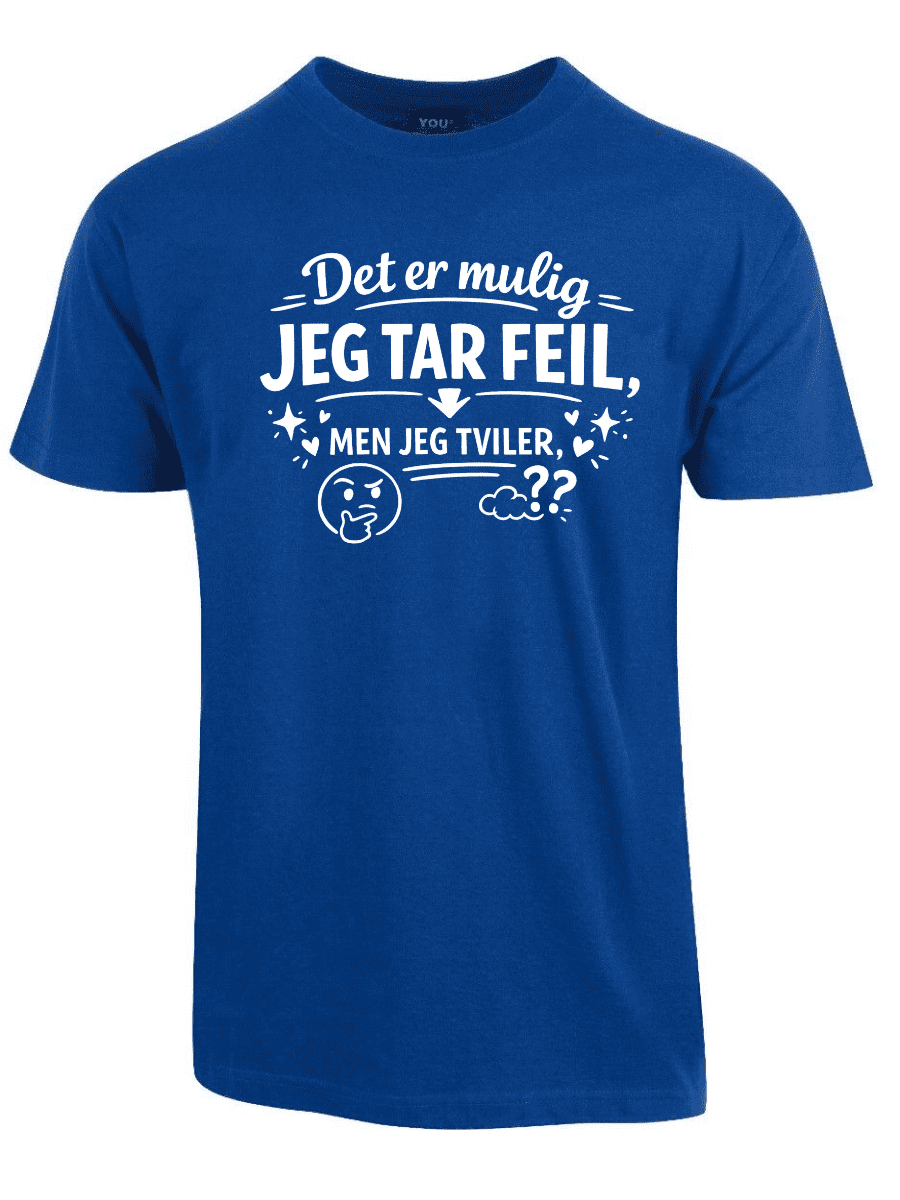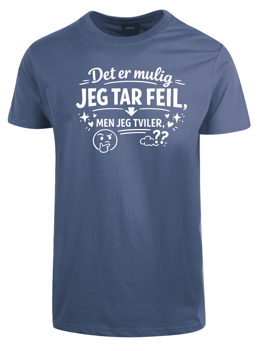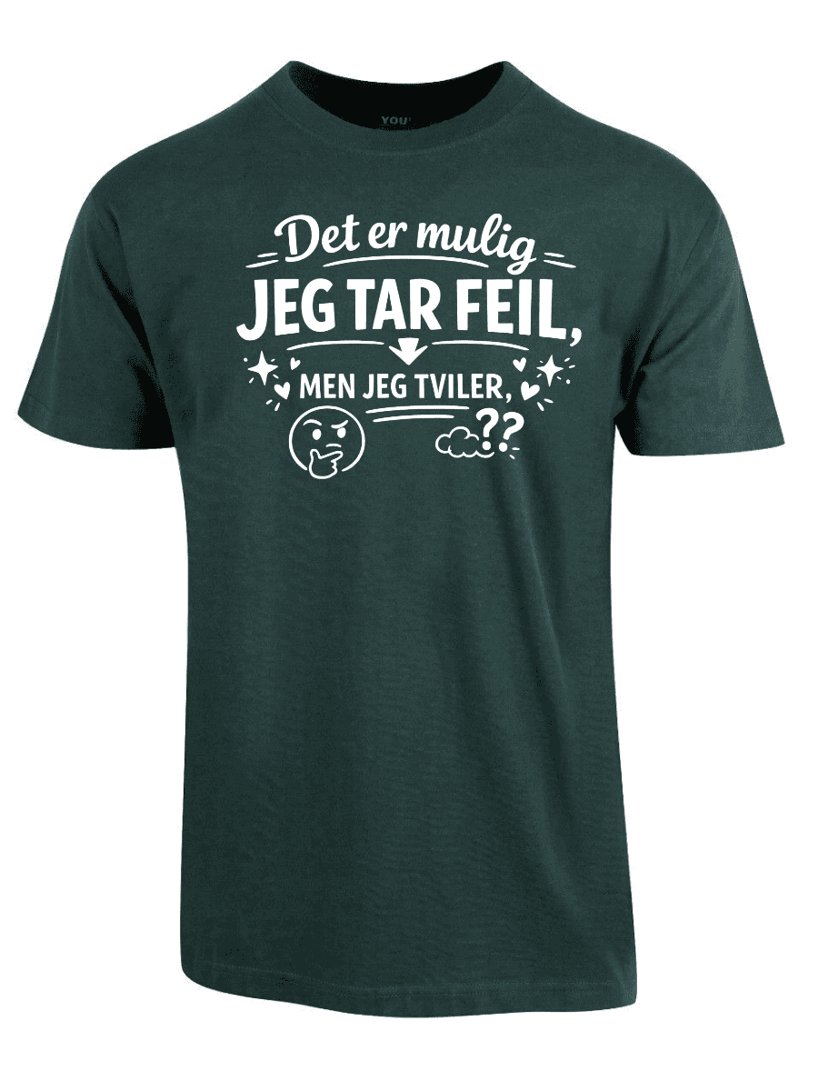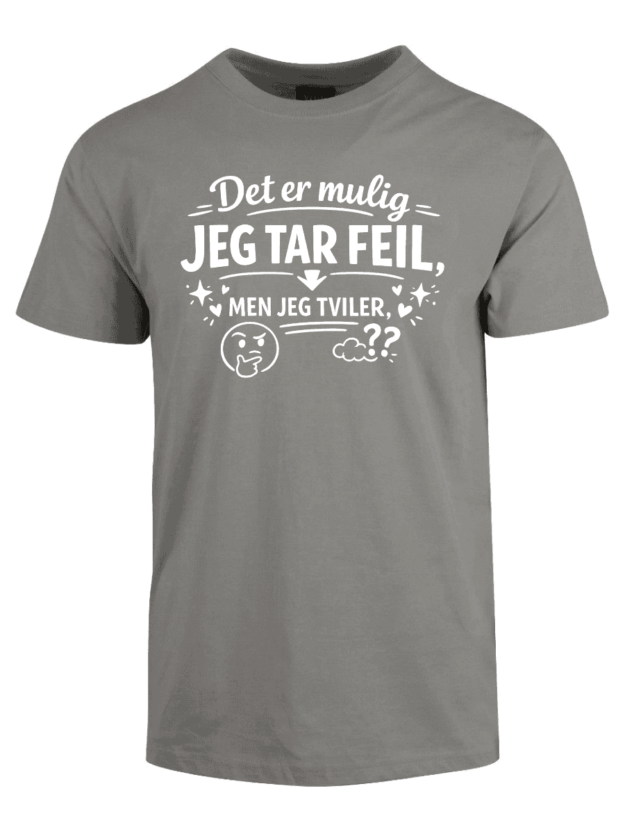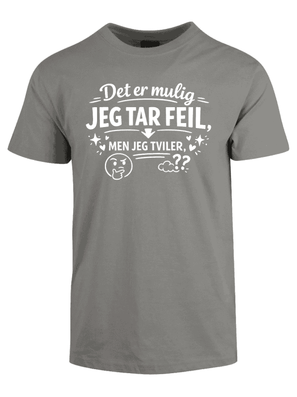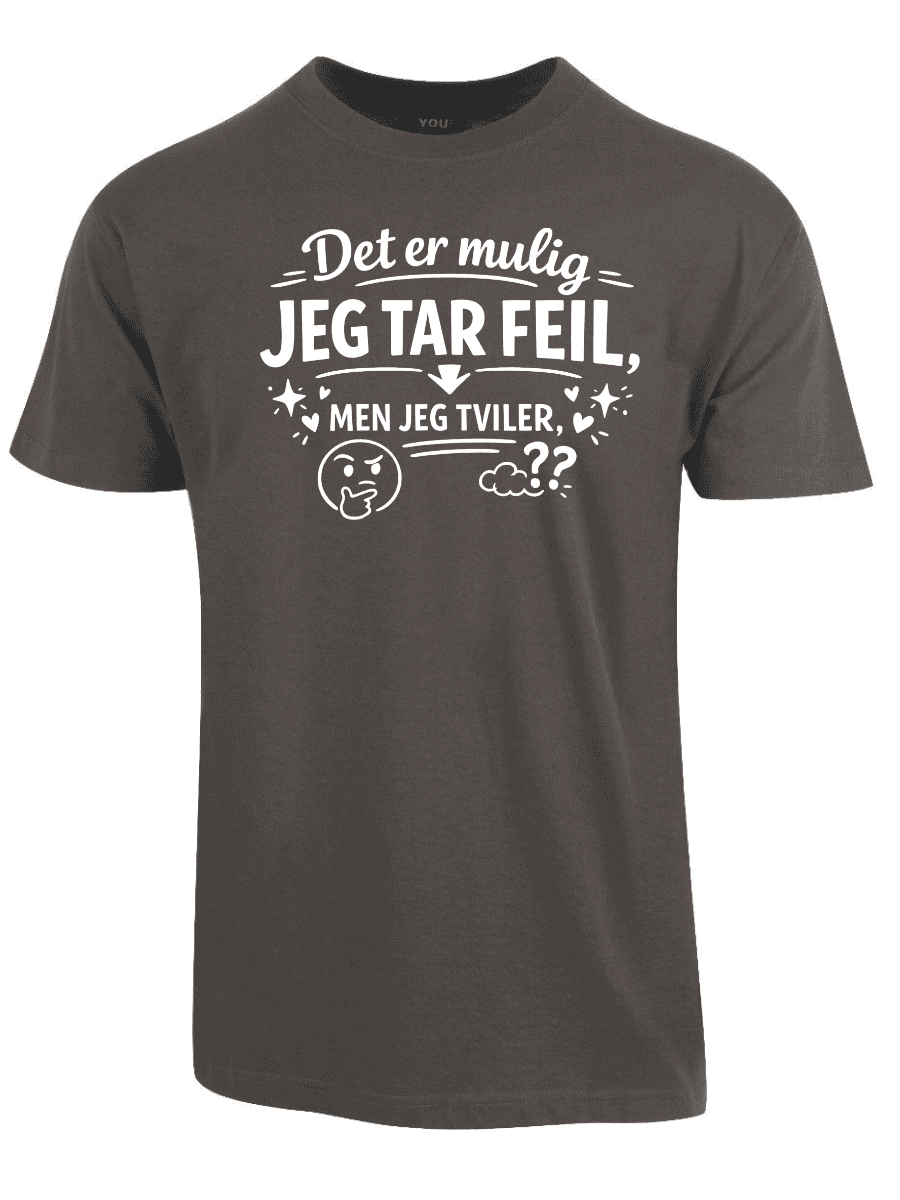 Vi kjenner alle typen: personen som dobbeltsjekker, som har research på lager, som faktisk vet hva de snakker om – og som sjelden, om noensinne, tar feil. Hvis dette er deg, eller du kjenner noen som alltid har rett (og som ikke er redde for å si det), er «Det er mulig jeg tar feil, men jeg tviler» perfekt. Teksten er plassert tydelig på brystet og sender et klart budskap: du er åpen for muligheten, men oddsen er ikke akkurat i favør av det.