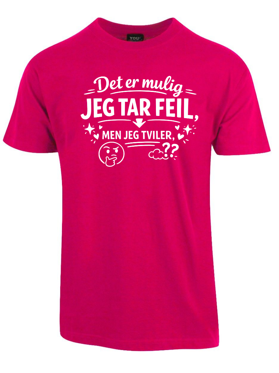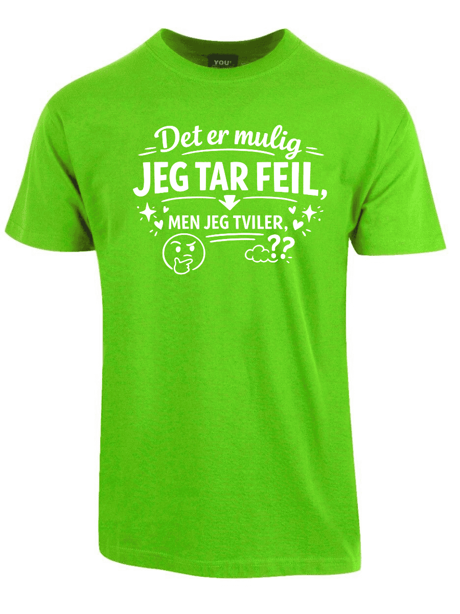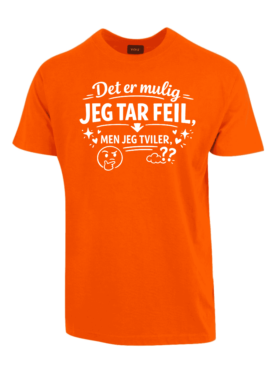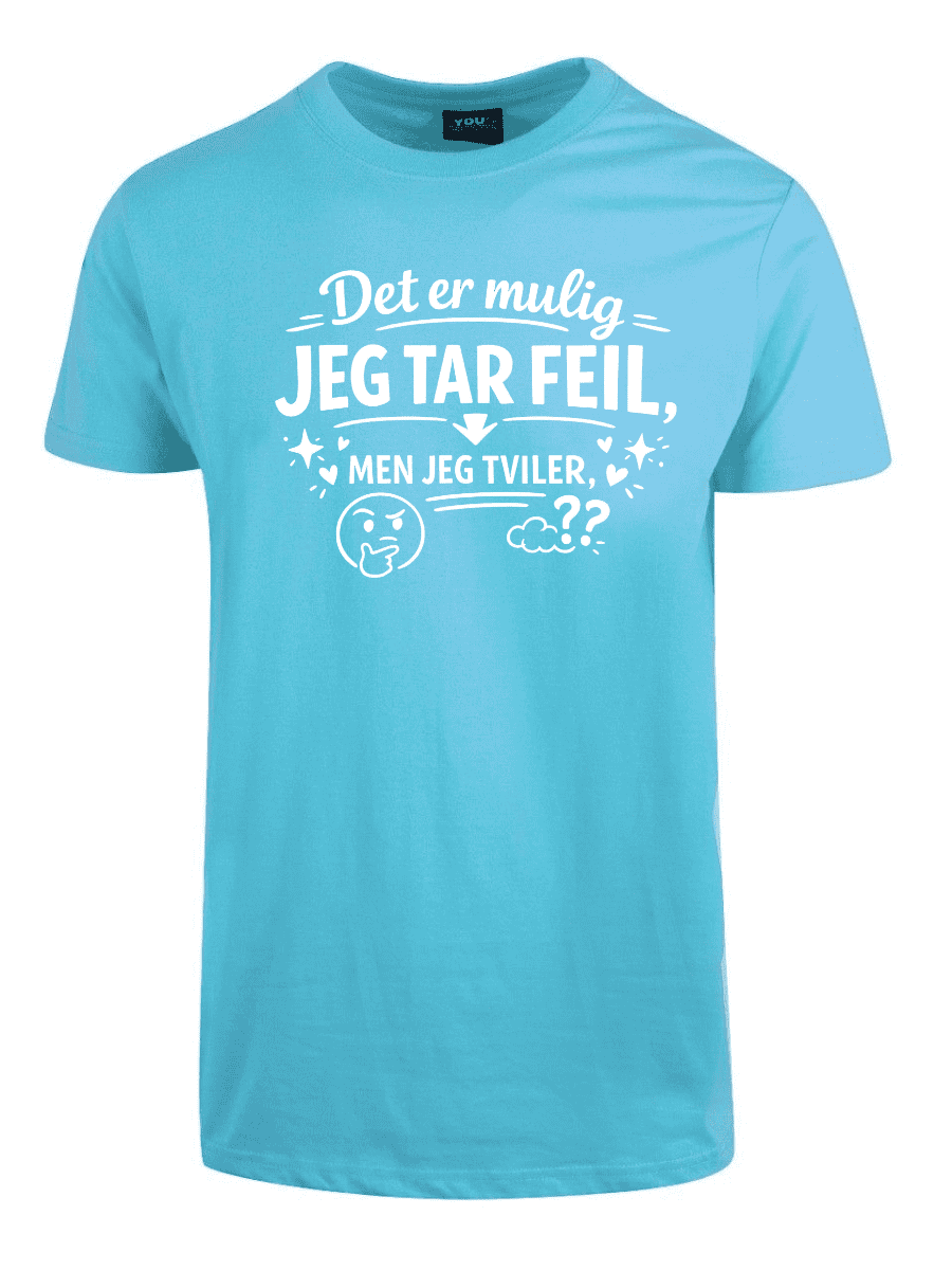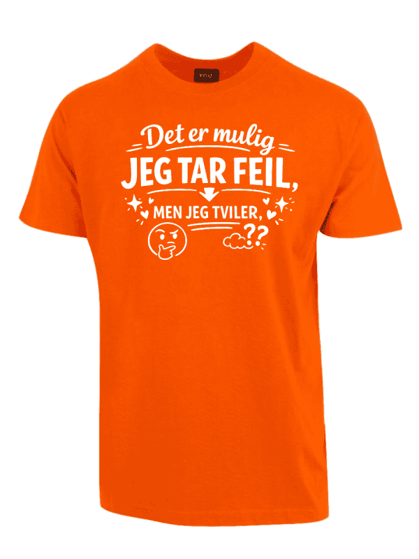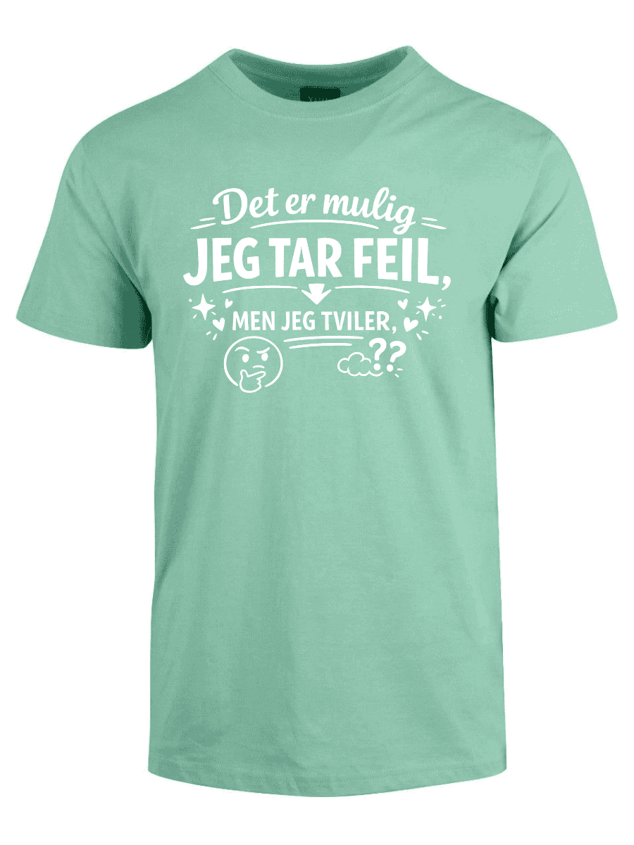 Vi kjenner alle typen: personen som dobbeltsjekker, som har research på lager, som faktisk vet hva de snakker om – og som sjelden, om noensinne, tar feil. Hvis dette er deg, eller du kjenner noen som alltid har rett (og som ikke er redde for å si det), er «Det er mulig jeg tar feil, men jeg tviler» perfekt. Teksten er plassert tydelig på brystet og sender et klart budskap: du er åpen for muligheten, men oddsen er ikke akkurat i favør av det.