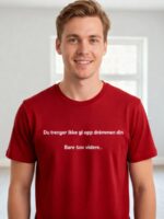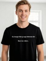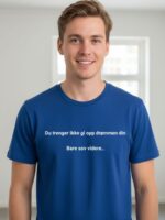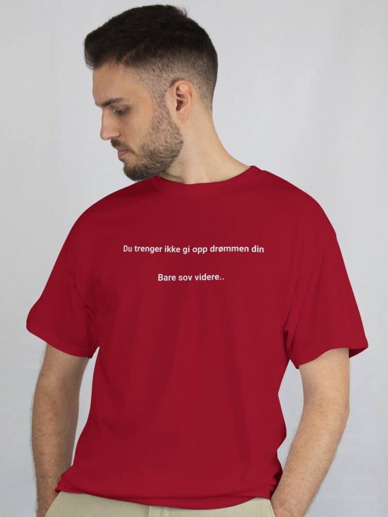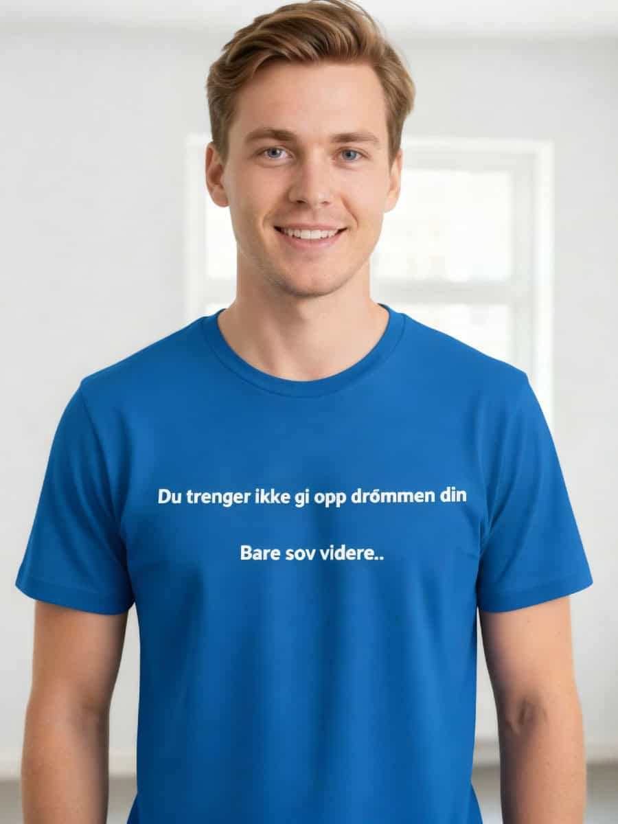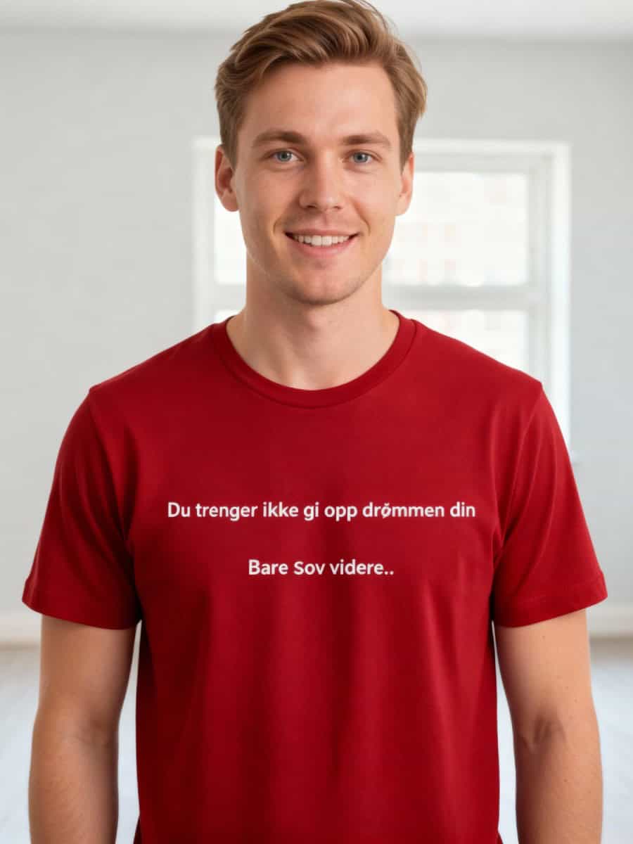 Noen T-skjorter er laget for å inspirere, andre for å få deg til å le. Denne klarer begge deler på én gang. Med teksten «Du trenger ikke gi opp drømmen din (Bare sov videre)» får du et plagg som kombinerer en tilsynelatende motiverende setning med en uventet og morsom vri. Resultatet er en T-skjorte som garantert skaper smil – og kanskje et lite gjenkjennende nikk fra de som elsker å ta en ekstra time på puta.