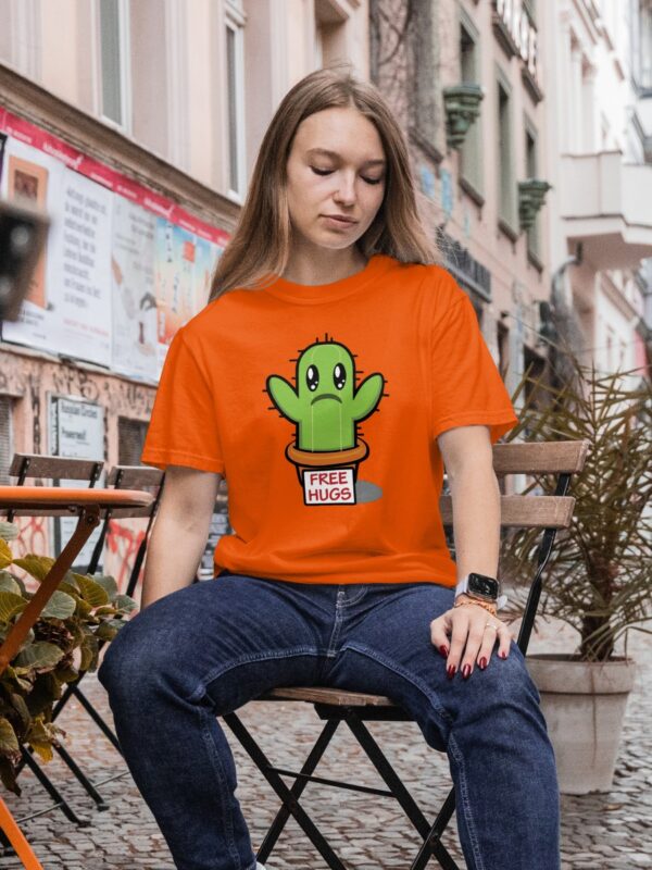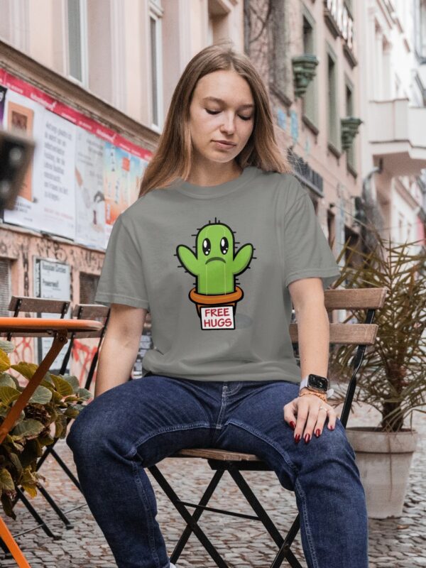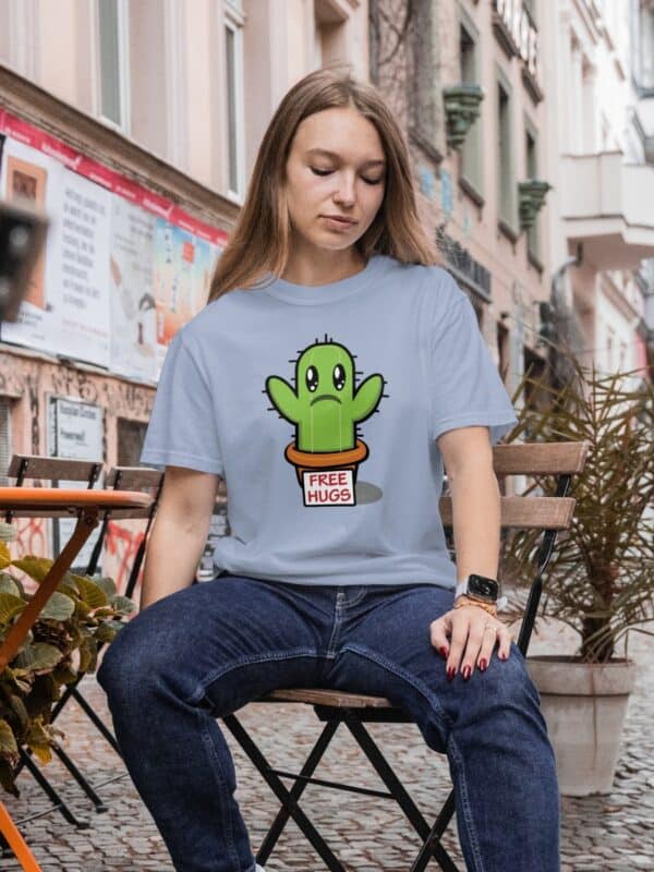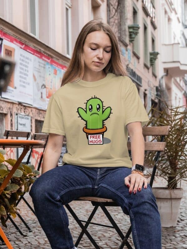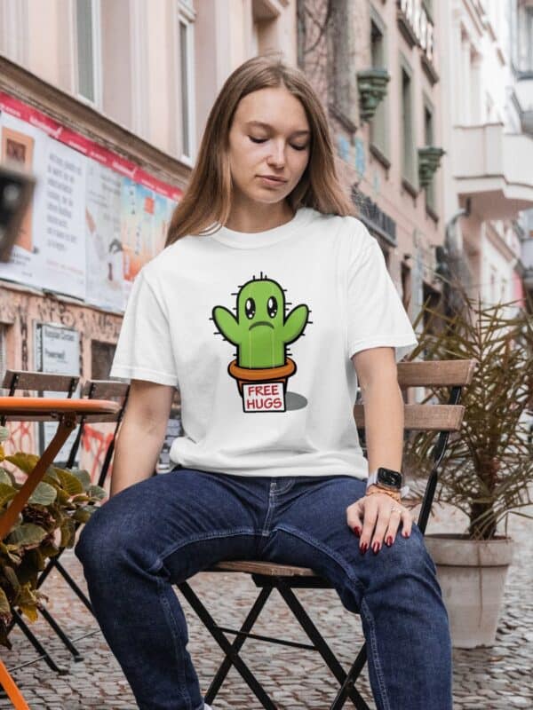 Alle trenger en klem – men noen burde kanskje ikke tilby dem. Denne Free hugs T-skjorte viser en trist liten kaktus med åpne armer og de beste intensjoner … helt til du ser piggene. Perfekt for deg som liker humor med stikk, og som vil få folk til å smile (på trygg avstand).