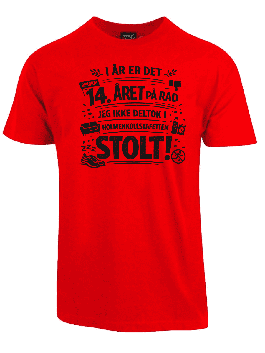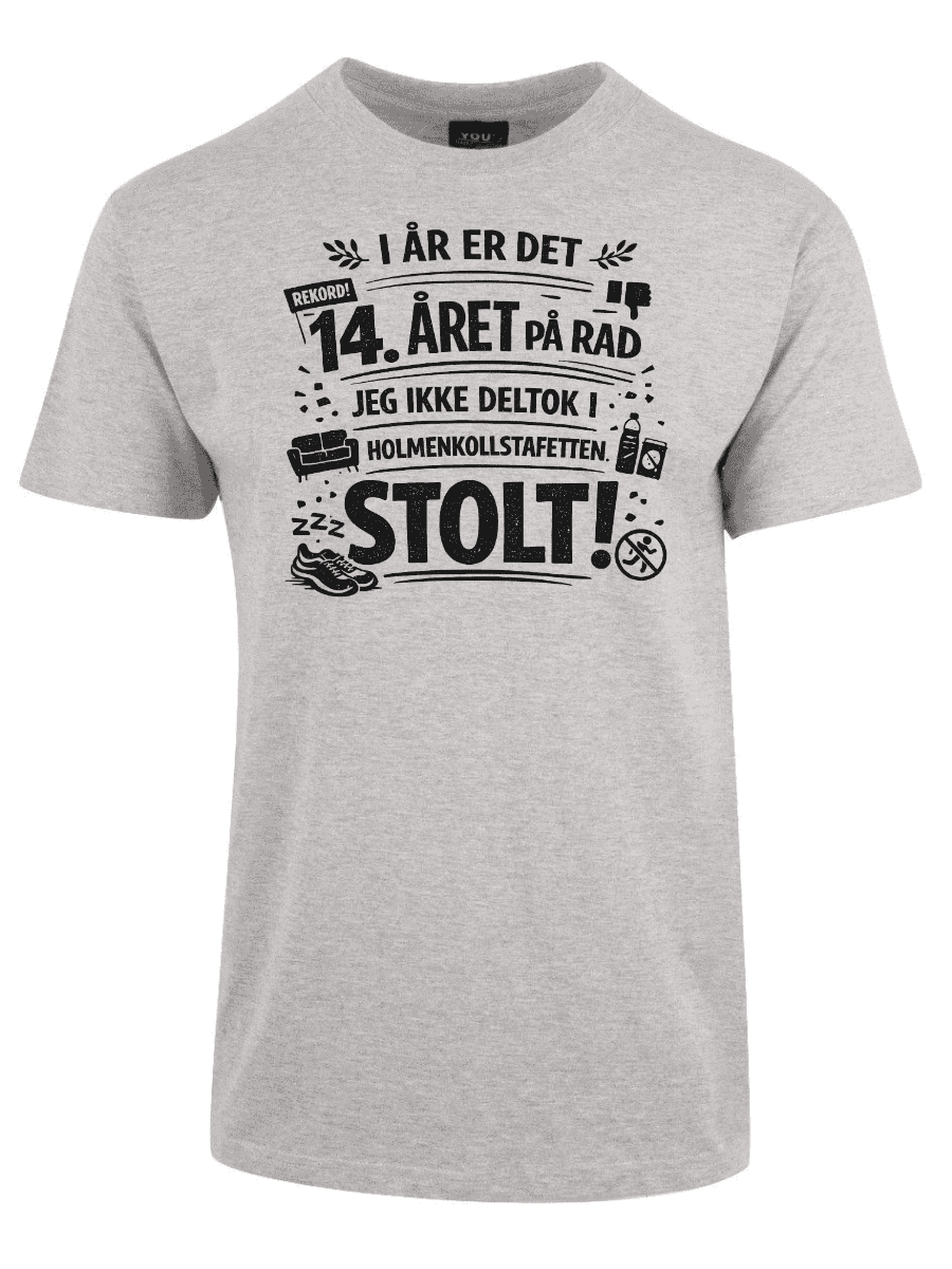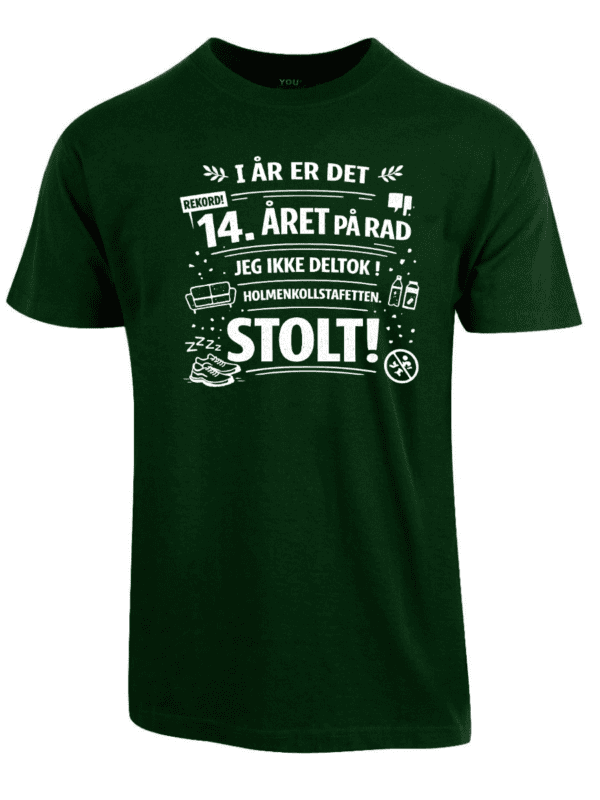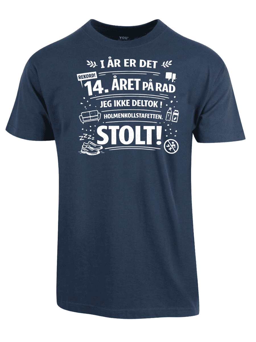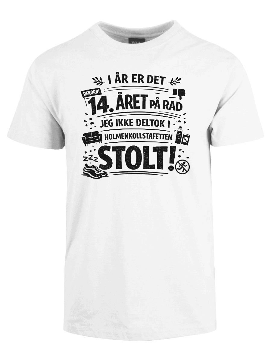 Holmenkollstafetten er en t-skjorte med teksten «I år er det 14. året på rad jeg ikke deltok i Holmenkollstafetten stolt!». Feiring av en imponerende rekke med ikke-deltagelse.