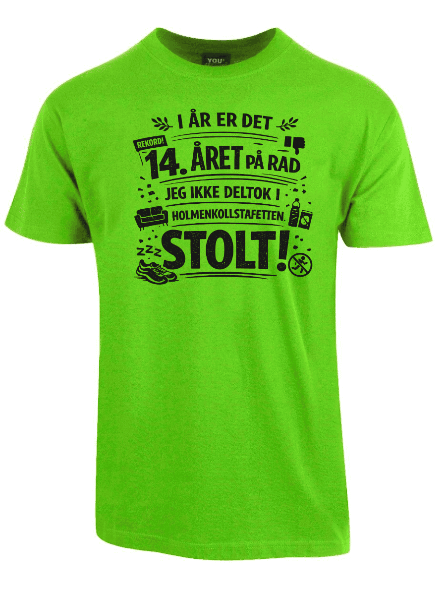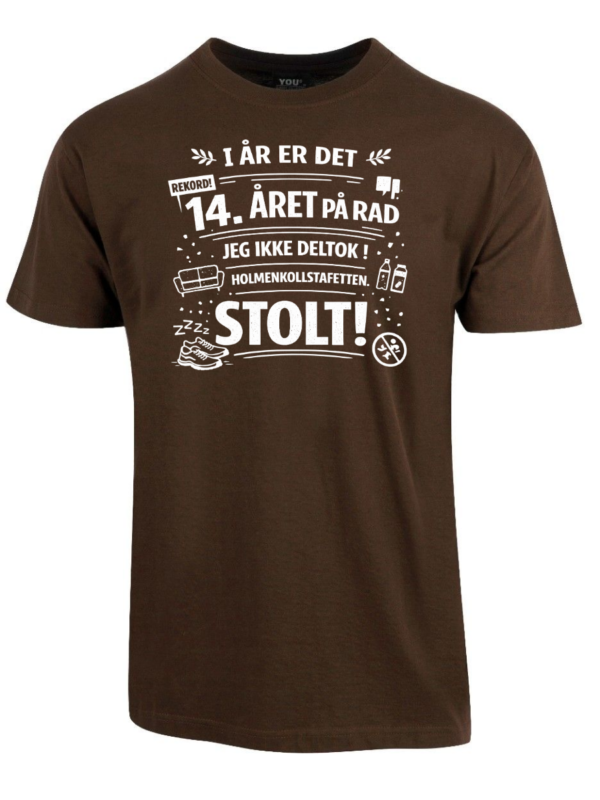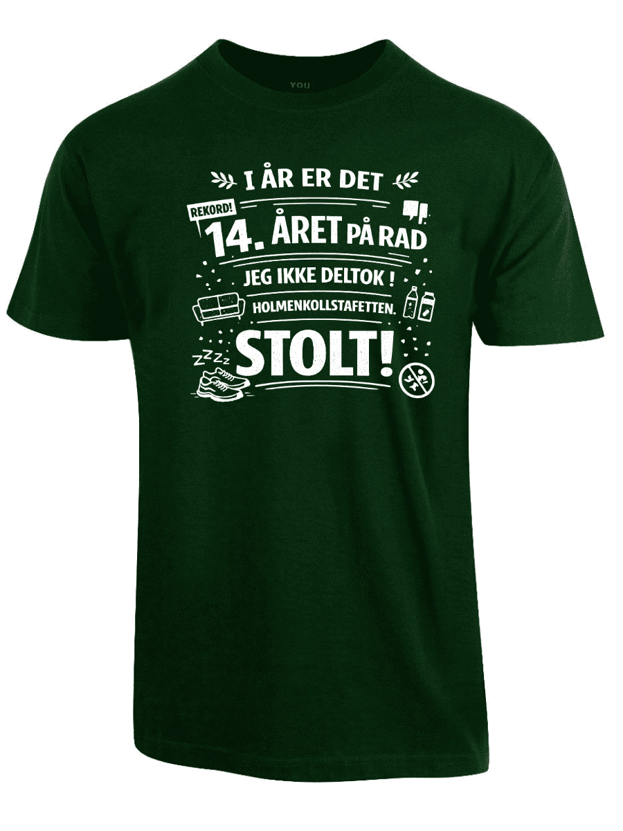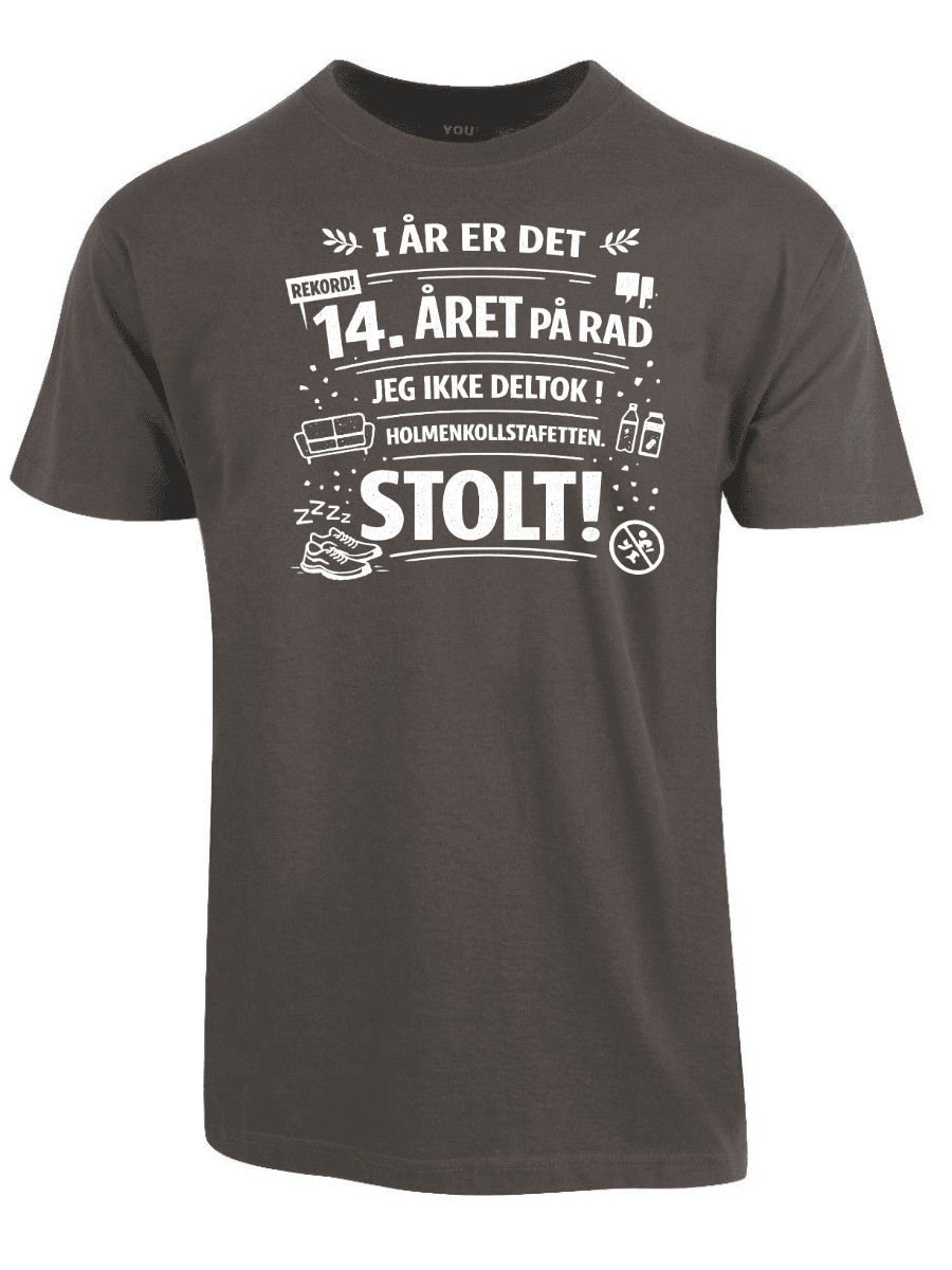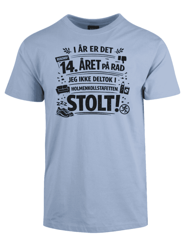Holmenkollstafetten er en t-skjorte med teksten «I år er det 14. året på rad jeg ikke deltok i Holmenkollstafetten stolt!». Feiring av en imponerende rekke med ikke-deltagelse.