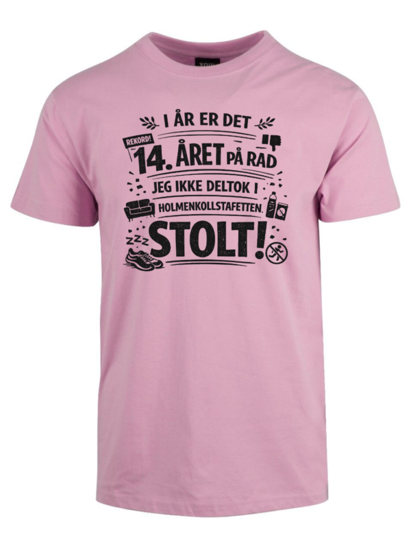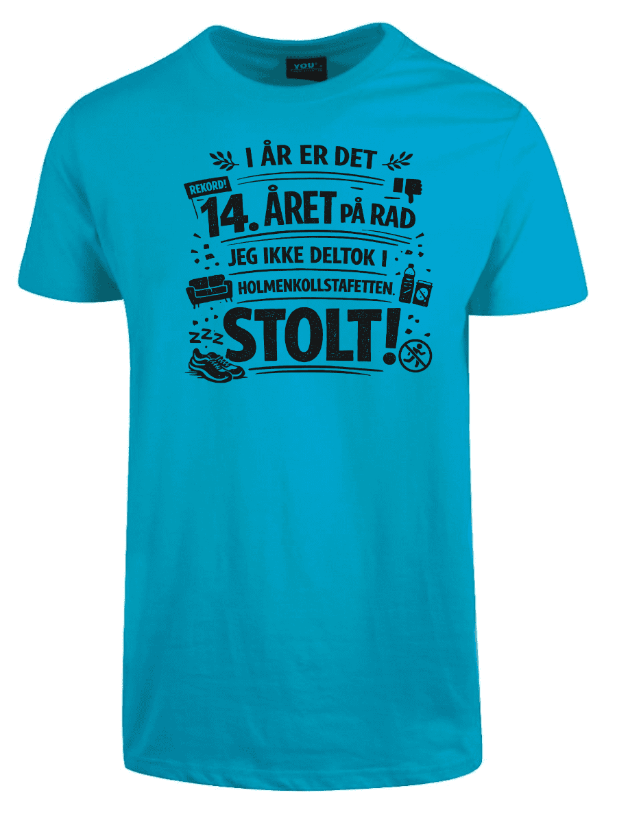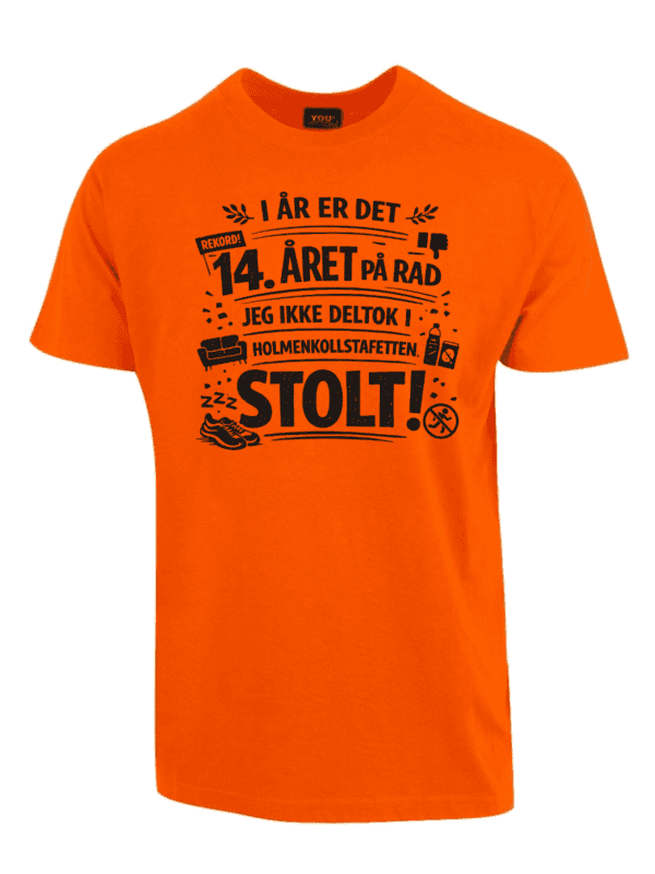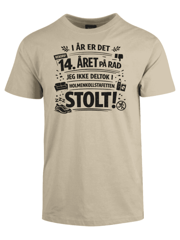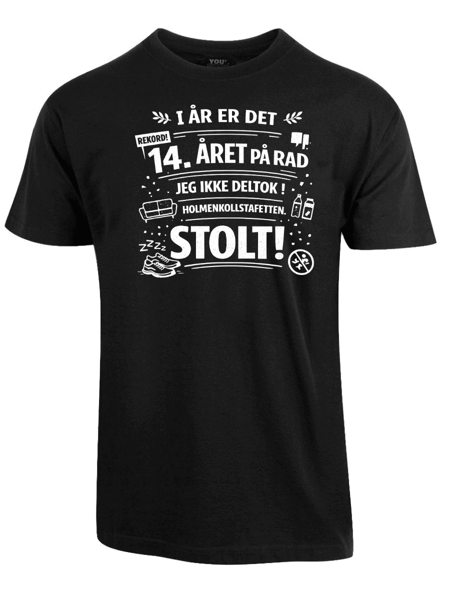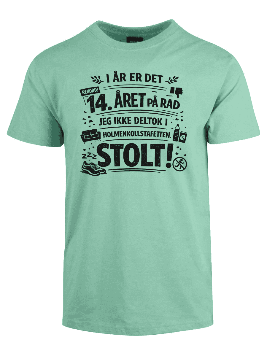Holmenkollstafetten er en t-skjorte med teksten «I år er det 14. året på rad jeg ikke deltok i Holmenkollstafetten stolt!». Feiring av en imponerende rekke med ikke-deltagelse.