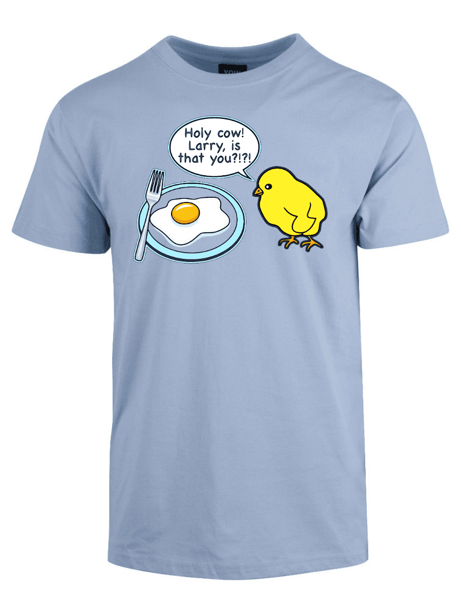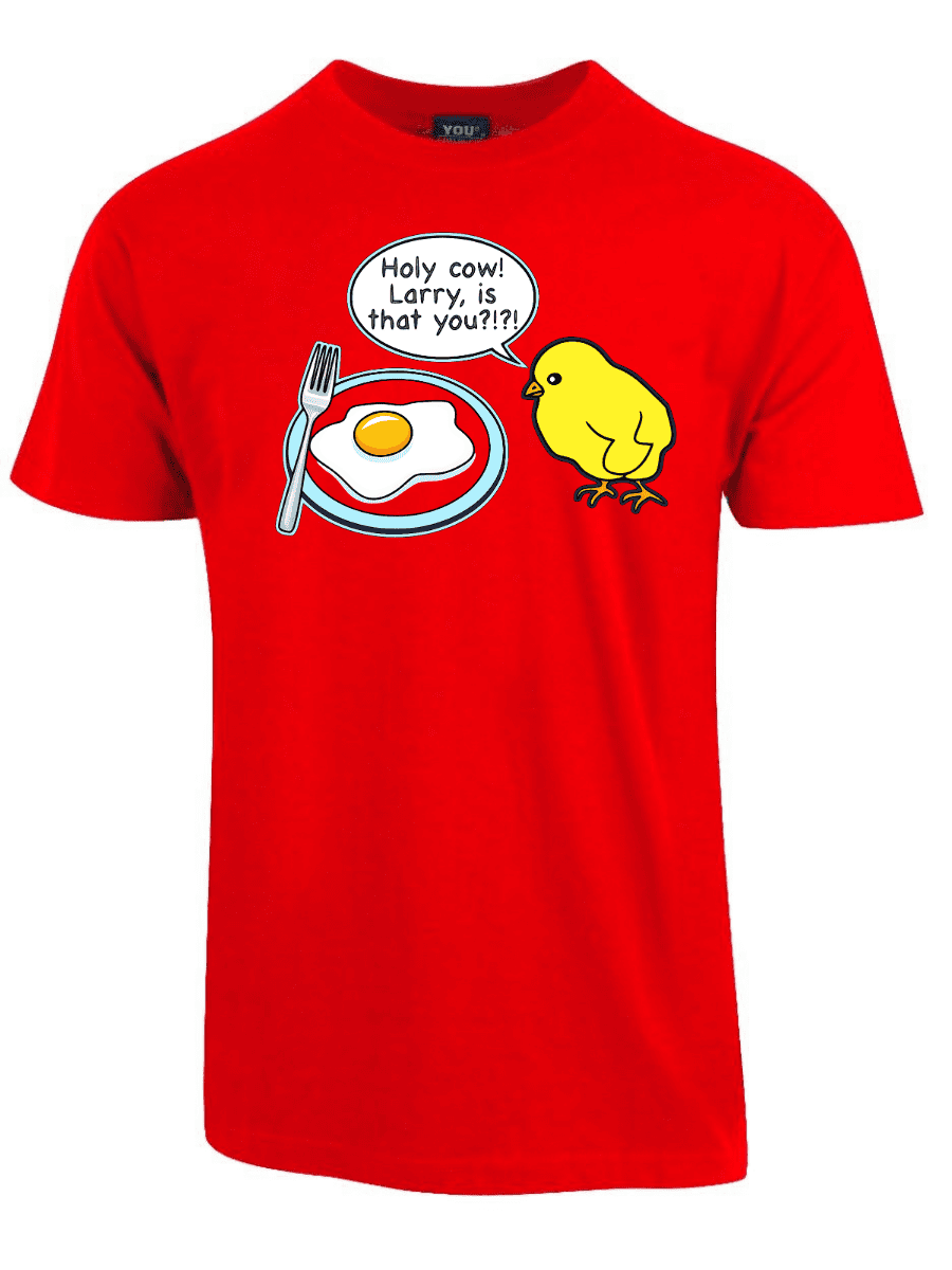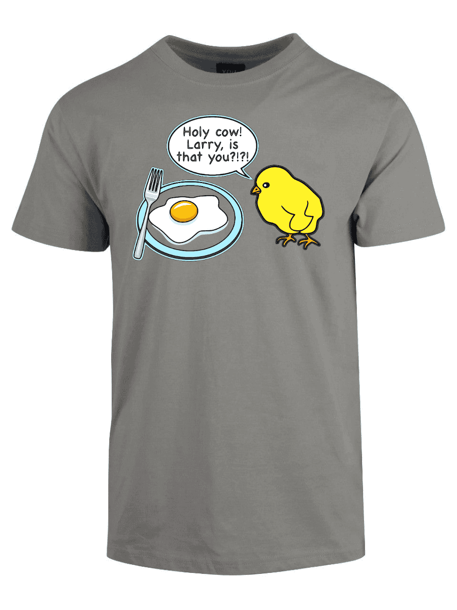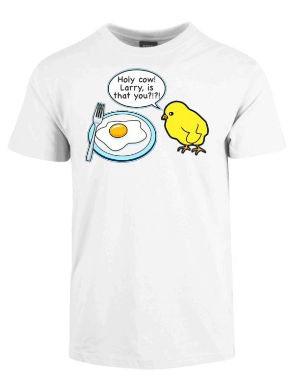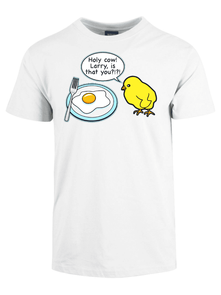 Morsom t-skjorte med en kylling som ser et stekt egg og sier: Holy cow Larry, er det deg.