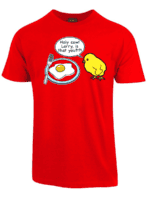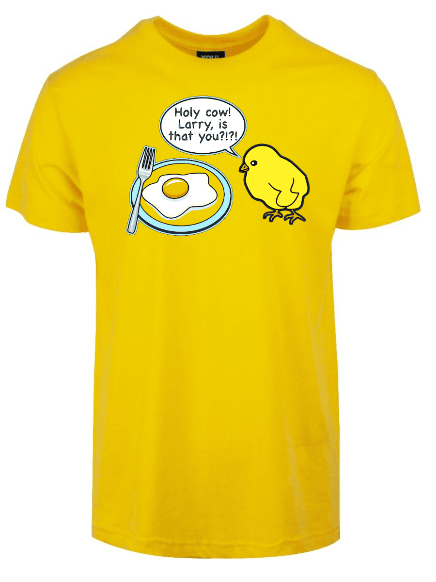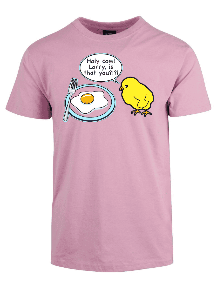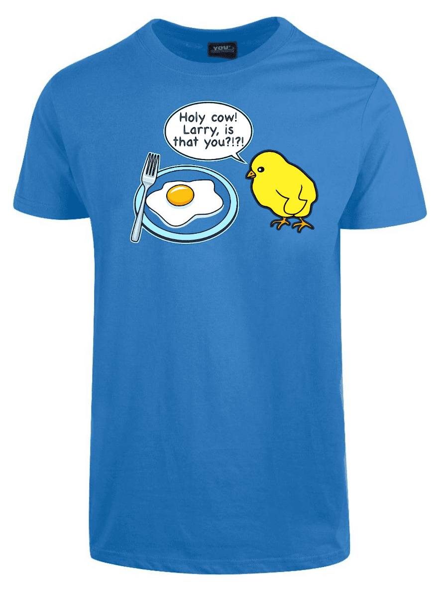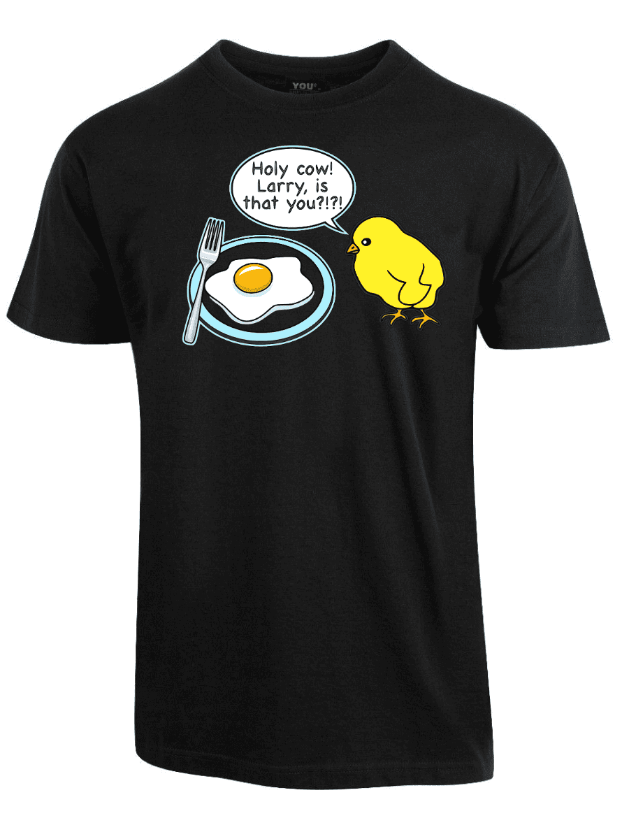 Morsom t-skjorte med en kylling som ser et stekt egg og sier: Holy cow Larry, er det deg.