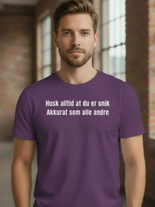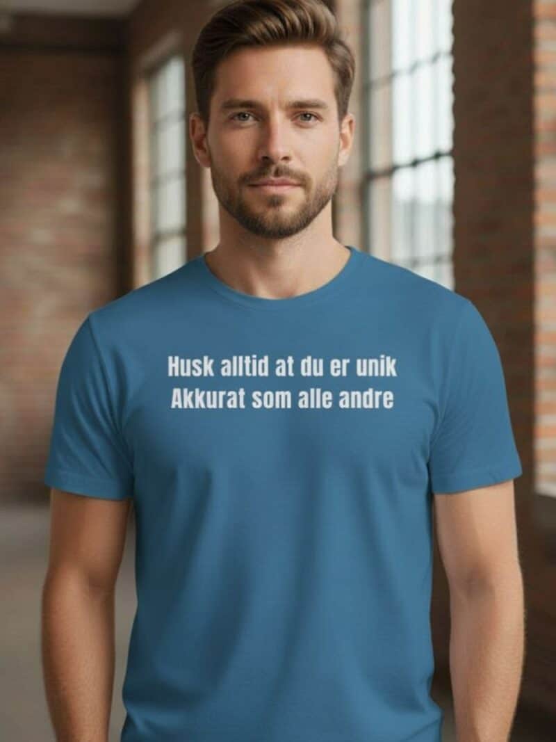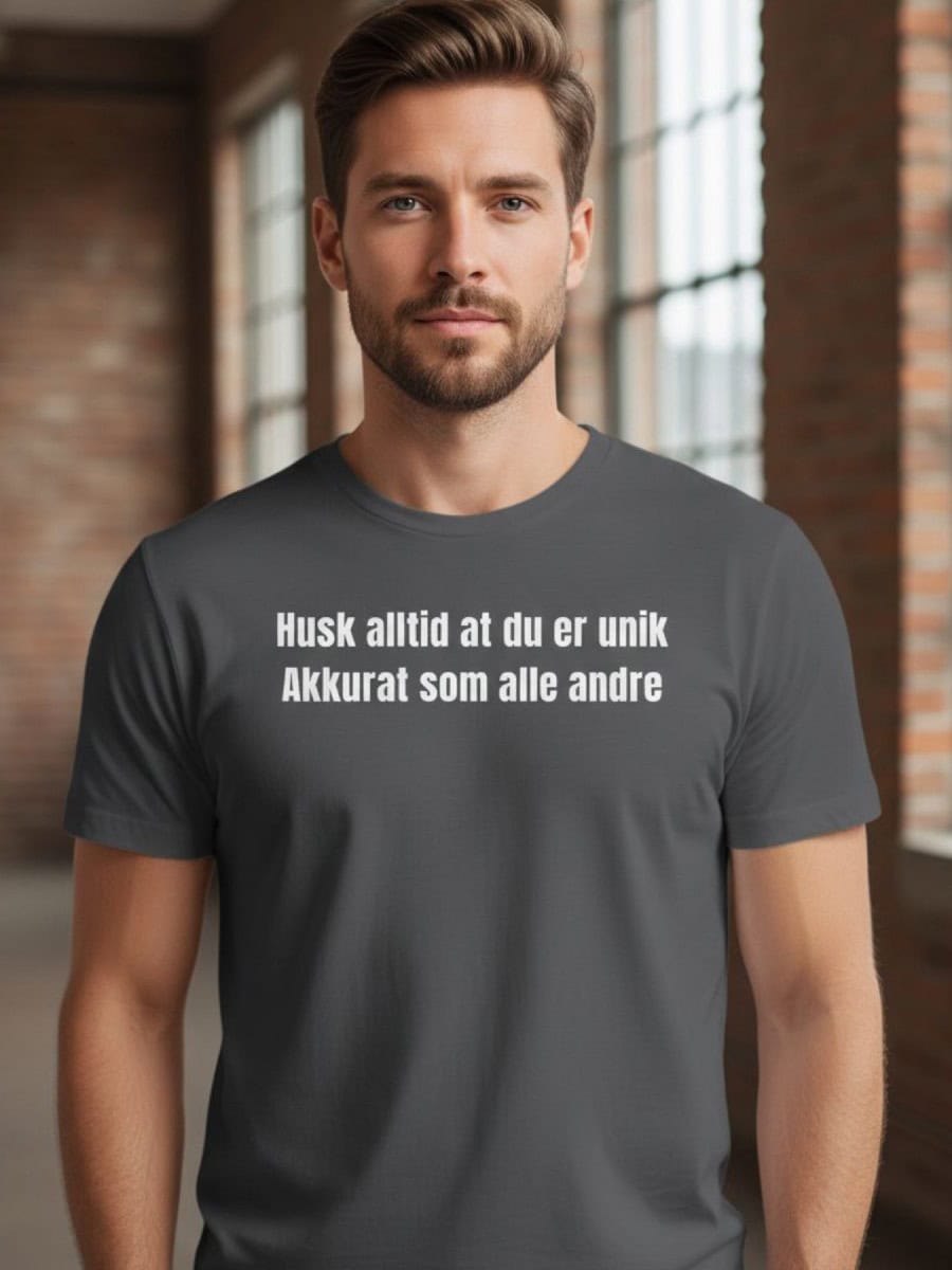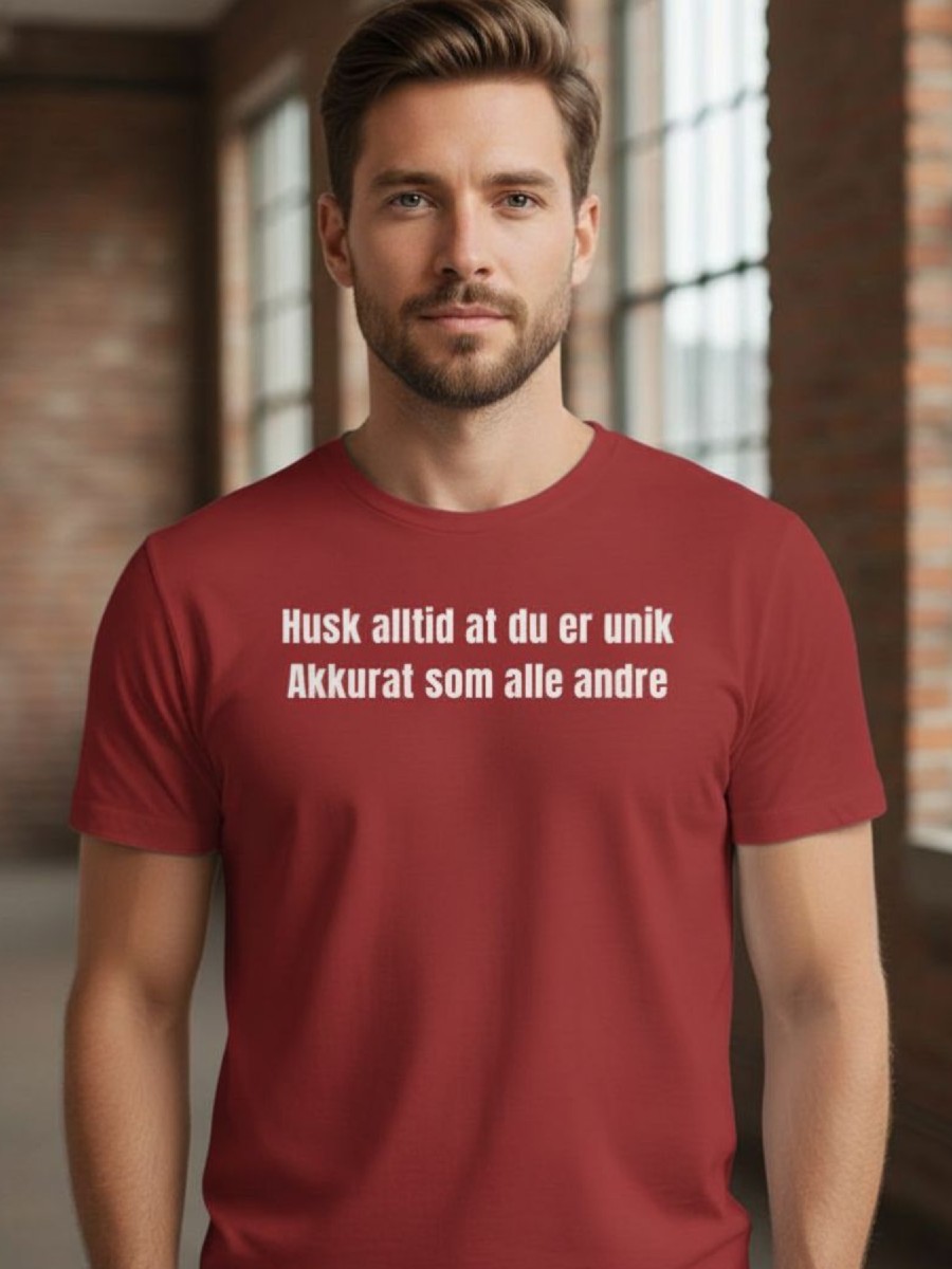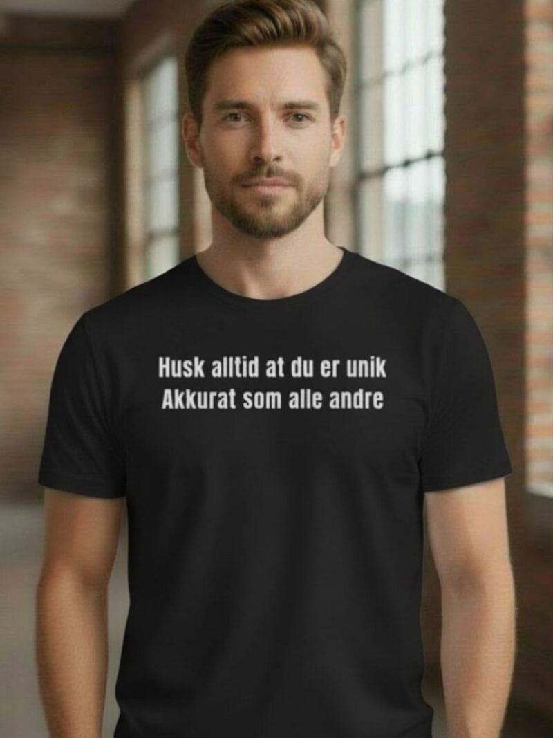 Humor trenger ikke alltid være høylytt eller drøy – noen ganger er den subtil og ironisk. Med teksten «Husk alltid at du er unik akkurat som alle andre» får du en T-skjorte som kombinerer livsvisdom med en liten porsjon selvironi. Resultatet er et plagg som får folk til å smile, nikke gjenkjennende og kanskje slippe en liten latter.