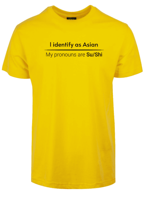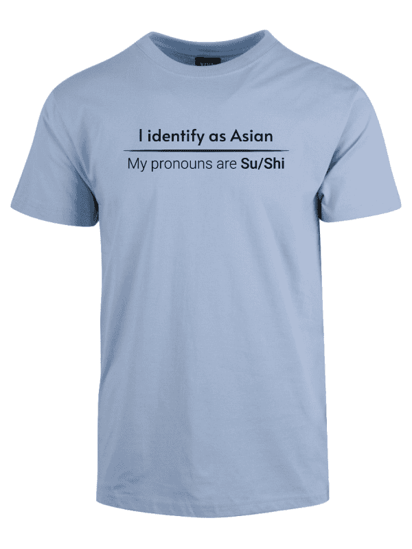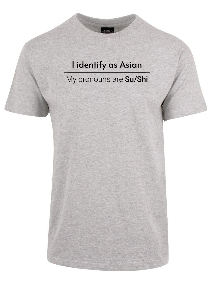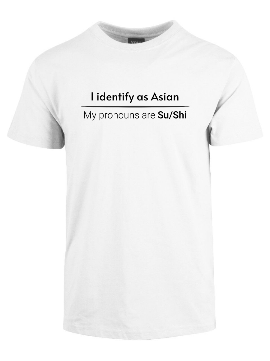 «I identify as Asian. My pronouns are Su/Shi» er ideell for alle som er lei av woke-kulturen, pronomen-obsessen og det faktum at man ikke lenger kan si noe uten å krenke noen. Ta den på når du vil vise at du ikke kjøper dagens identitets-tull, når du henger med folk som skjønner satire, eller bare når du vil provosere litt på den riktige måten.