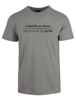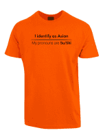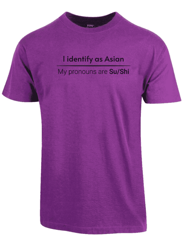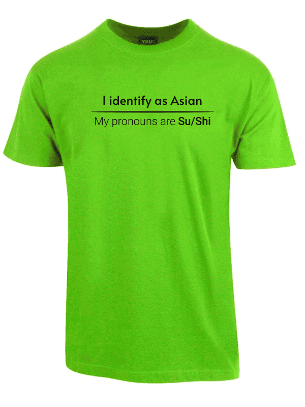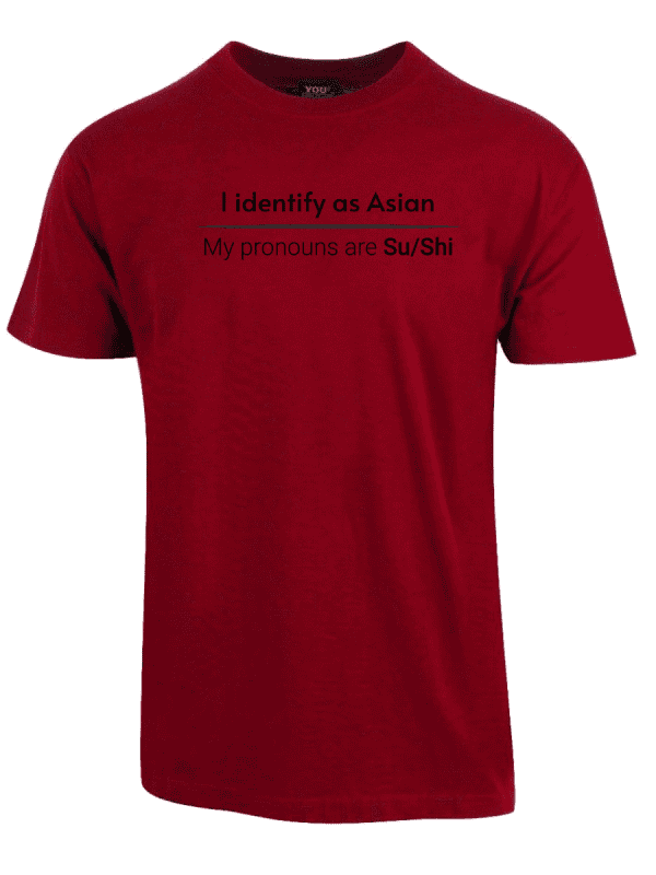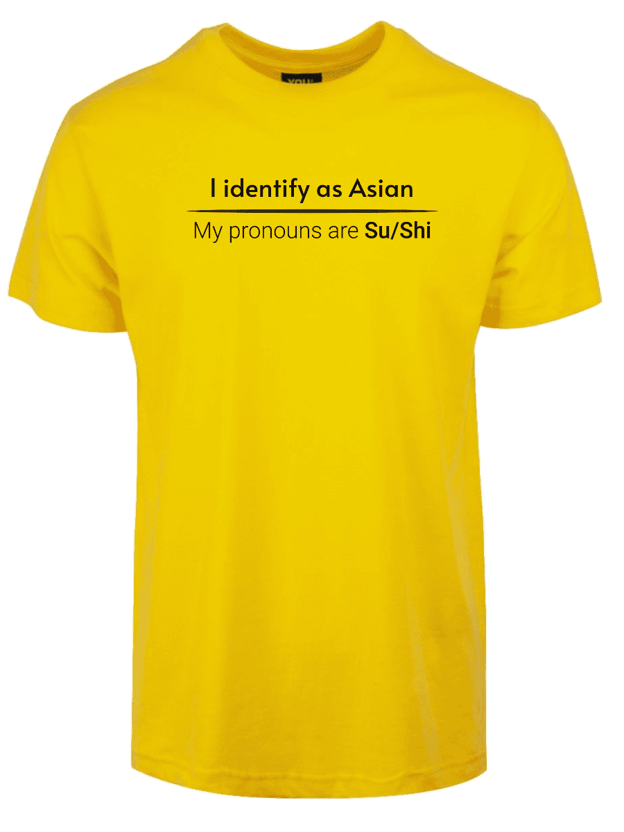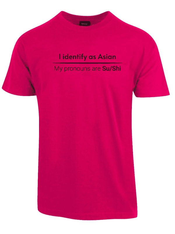 «I identify as Asian. My pronouns are Su/Shi» er ideell for alle som er lei av woke-kulturen, pronomen-obsessen og det faktum at man ikke lenger kan si noe uten å krenke noen. Ta den på når du vil vise at du ikke kjøper dagens identitets-tull, når du henger med folk som skjønner satire, eller bare når du vil provosere litt på den riktige måten.