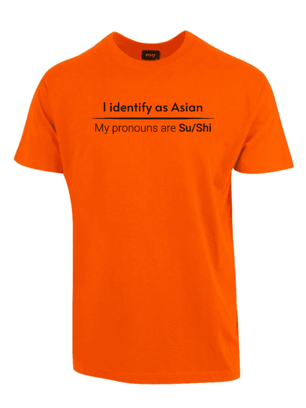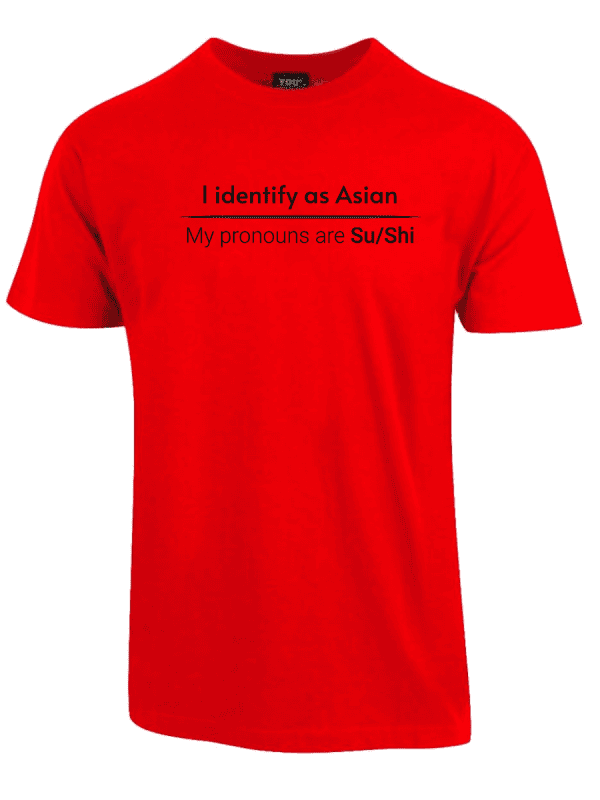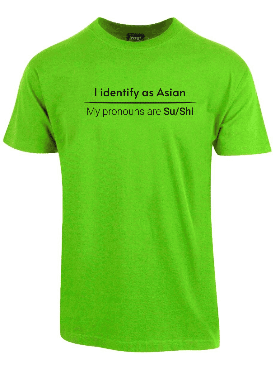 «I identify as Asian. My pronouns are Su/Shi» er en direkte parodi på det moderne samfunnet der identitet har blitt så flytende at ingenting lenger gir mening. Hvis folk kan identifisere seg som hva som helst og kreve respekt for selvoppfunnede pronomen, hvorfor ikke identifisere seg som en hel etnisitet med sushi-pronomen? Dette er humor for dem som ser absurditeten i dagens identitetspolitikk og som ikke er redde for å le av det.