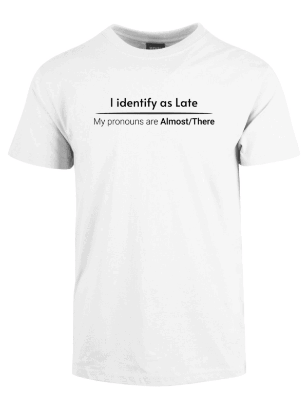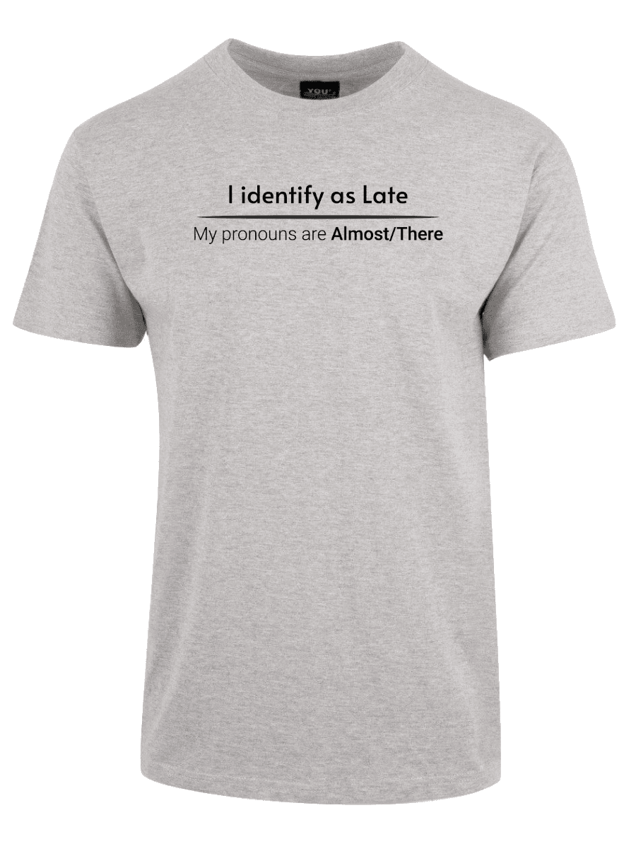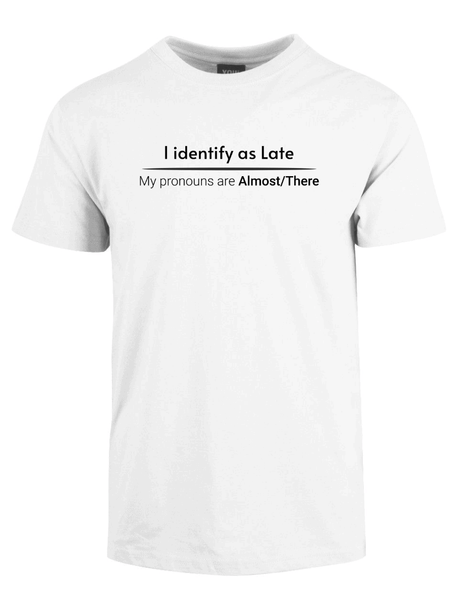 Dette er t-skjorten for alle som alltid kommer for sent, og som synes hele pronomen-greia har gått for langt. Hvis folk kan finne på xe/xem og alle mulige rare varianter, hvorfor kan du ikke identifisere deg som Late? Det er i hvert fall noe folk faktisk forstår.