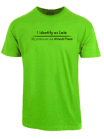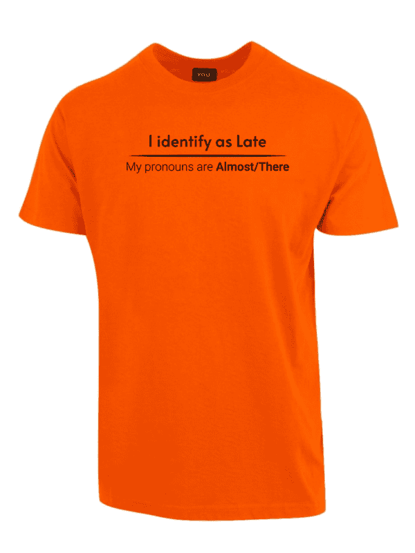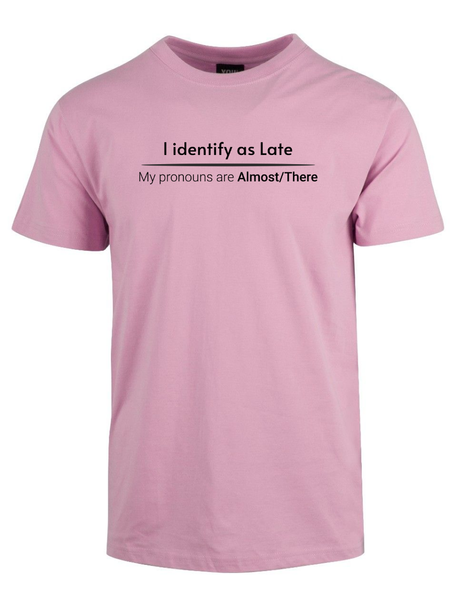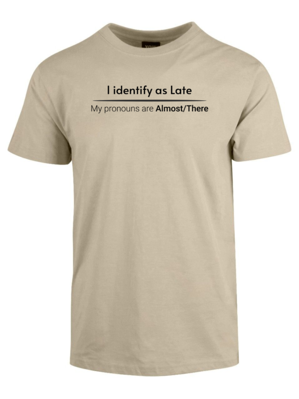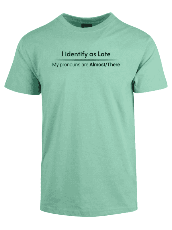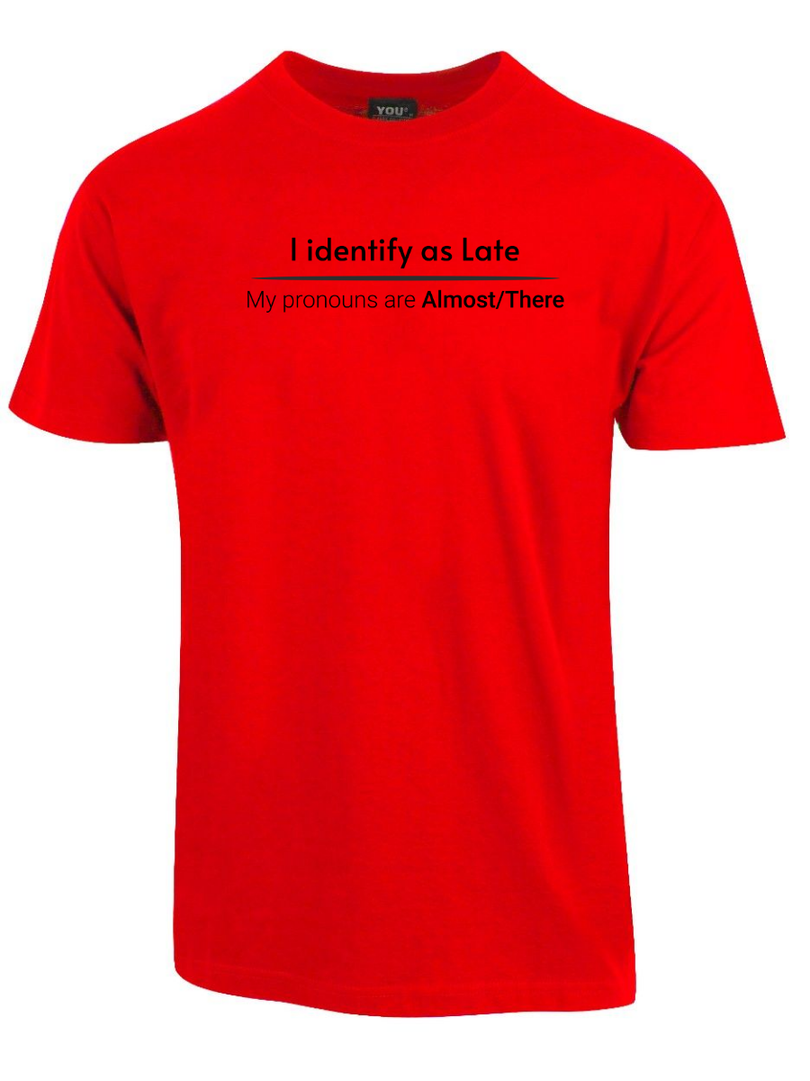 Dette er t-skjorten for alle som alltid kommer for sent, og som synes hele pronomen-greia har gått for langt. Hvis folk kan finne på xe/xem og alle mulige rare varianter, hvorfor kan du ikke identifisere deg som Late? Det er i hvert fall noe folk faktisk forstår.