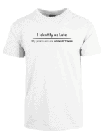 T-skjorten bruker identitetspolitikkens eget språk mot seg selv. Den tar hele konseptet og viser hvor latterlig det blir. Samtidig treffer den alle som faktisk er kronisk forsinkede. Som sier «jeg er på vei» når de fortsatt står i dusjen. Som møter opp tjue minutter etter avtalt tid.
