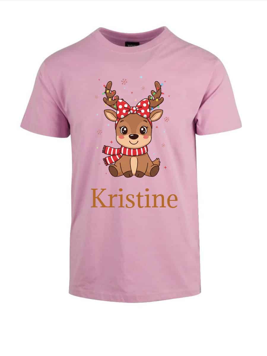 Gjør julen ekstra spesiell med denne søte Julemotiv jente med ditt eget navn T-skjorte. Motivet viser et nydelig reinsdyr pyntet med julelys, skjerf og et stort smil – klart for årets koseligste høytid! Her kan du legge til jentas eget navn under motivet, slik at T-skjorten blir helt personlig og unik.