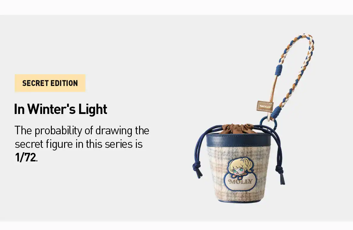 Hver Molly mini veske kommer i blind box, så du får en av seks regulære design: Teddy Bear, Oat Cup, Wavering Pine Needles, Bunny-soft Fuzz, Robin Redbreast eller Red Velvet Cocoa. Alle inspirert av vinteroutfits med teksturerte stoffer, myke toner og detaljer som faktisk er synlige. Secret edition heter «In Winter’s Light» med 1/72 sjanse. Den er selvfølgelig mer verdt om du treffer.