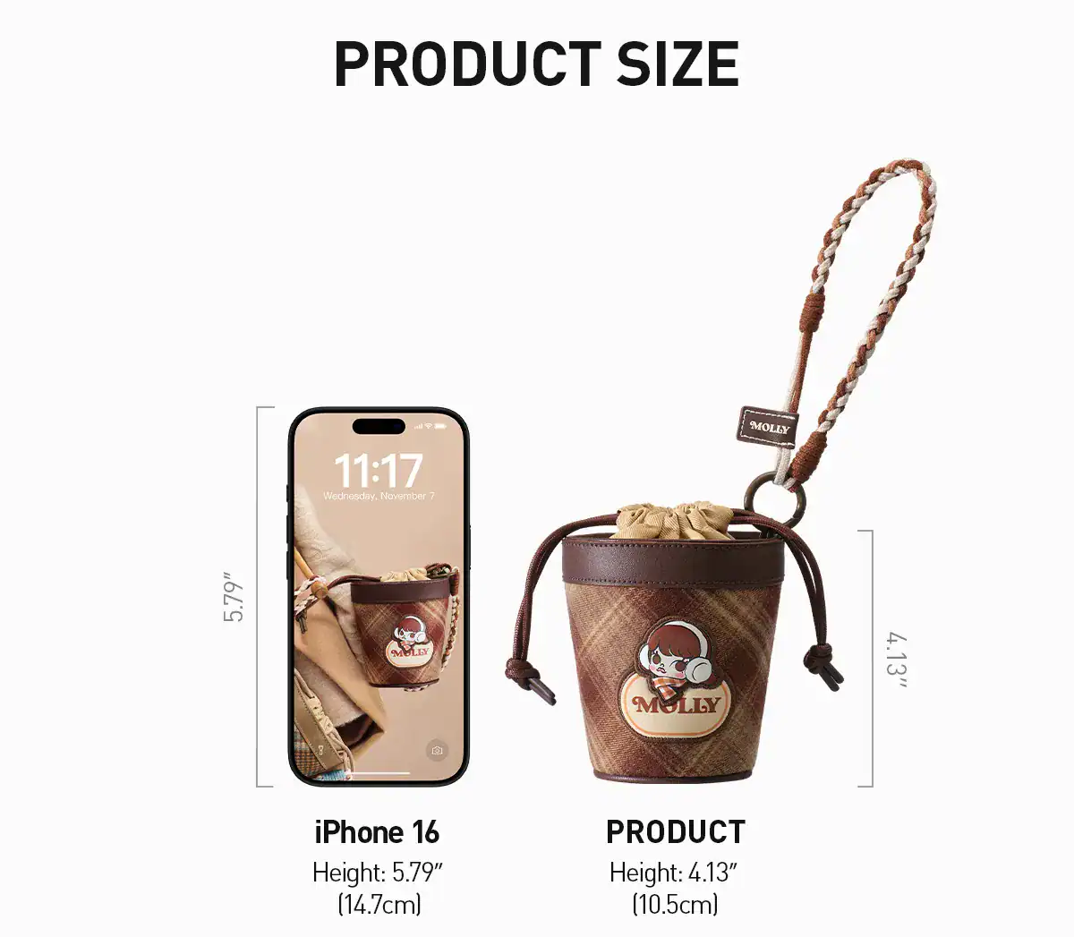 Molly mini veske er blind box-produktet som faktisk kan brukes til noe. Dette er ikke bare en samlegjenstanden som står på hylla – det er en funksjonell minipose fra Pop Marts Winter Fit Check-serie som kan frakte smånøkler, mynter, ørepropper eller annet småtteri. 10,5 cm høy med åpningsdiameter på 9,5 cm og bunndiameter på 6,5 cm. Akkurat passe størrelse.