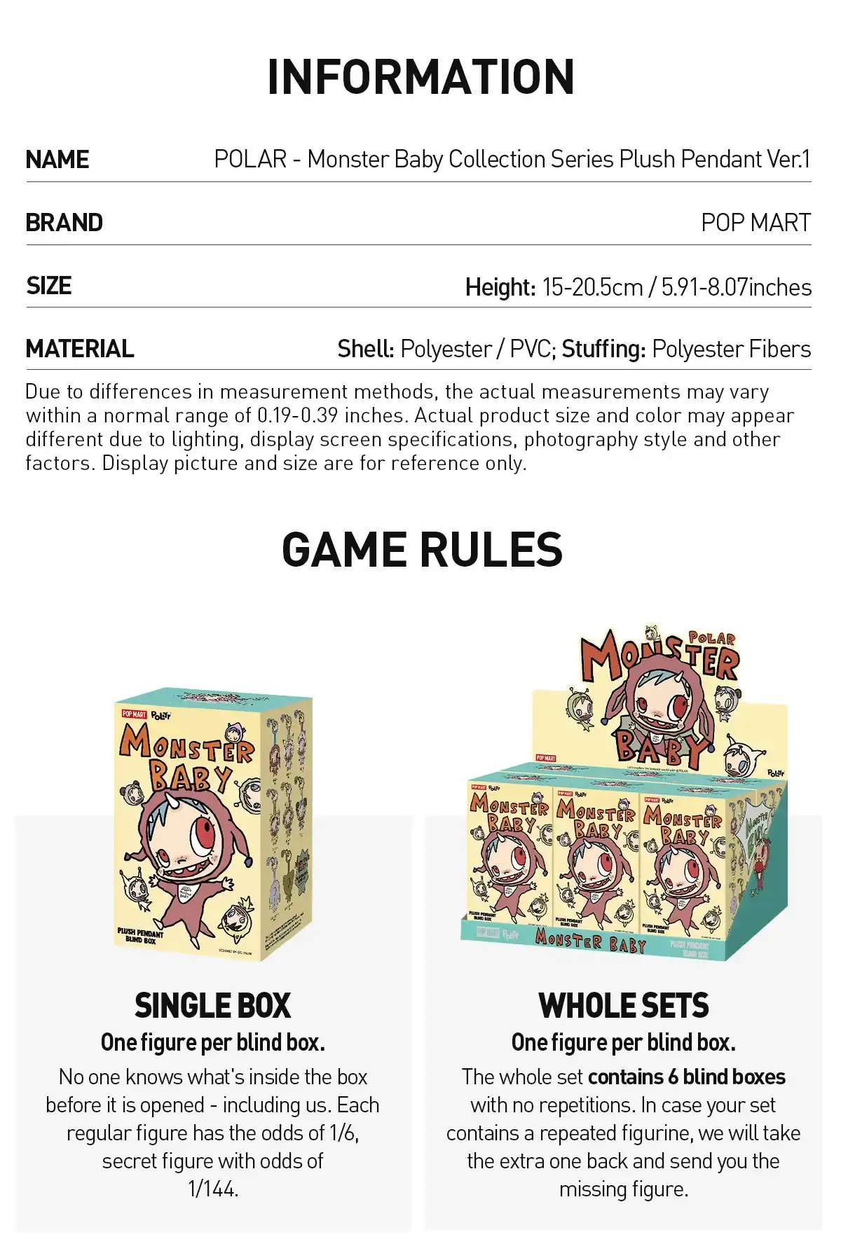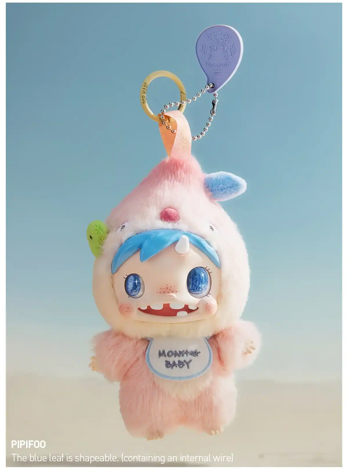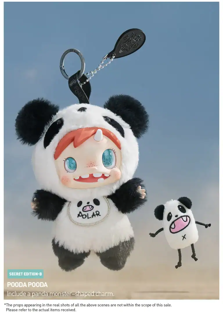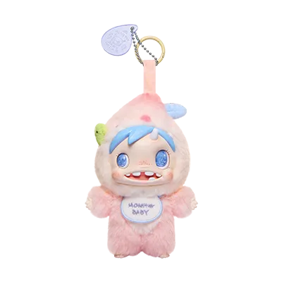 Monster Baby er blind box-vedhengene som kombinerer søt og creepy på en måte som faktisk fungerer. Dette er POLAR-karakteren redesignet som baby-ansiktige monstre i plysj fra Pop Mart. Høyde på 15-20,5 cm, laget av polyester og PVC med myk polyesterfiberfyll. De er klembare, ikke stive.