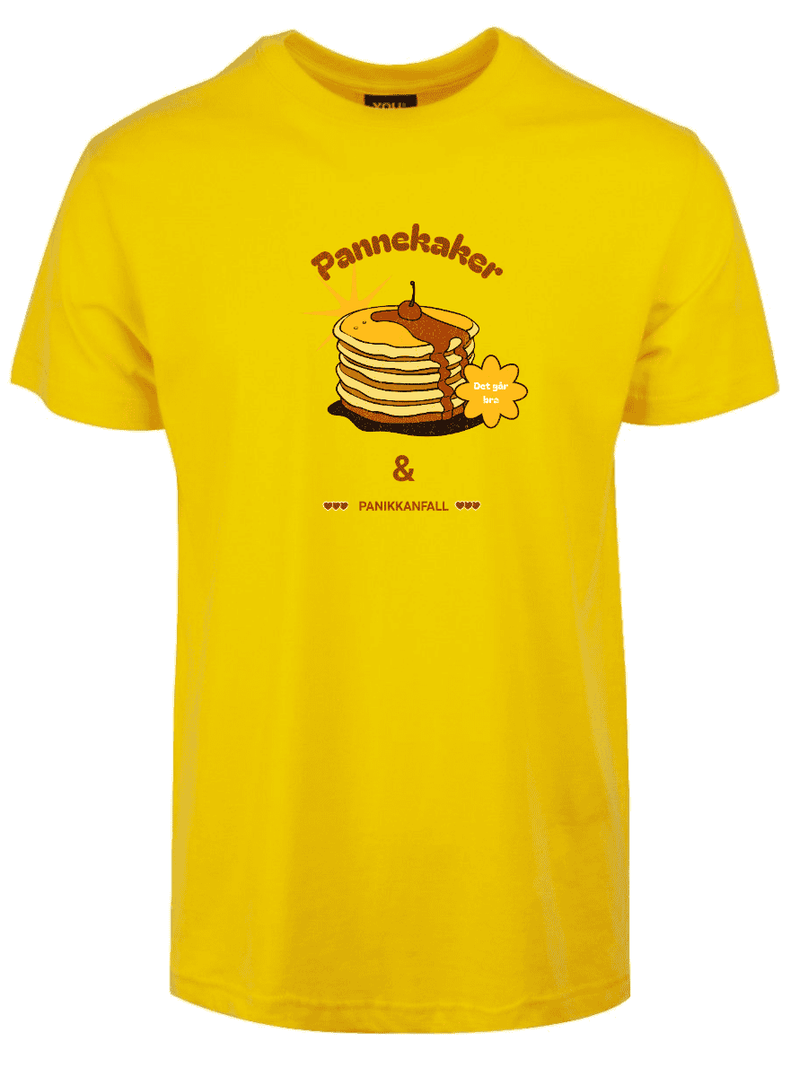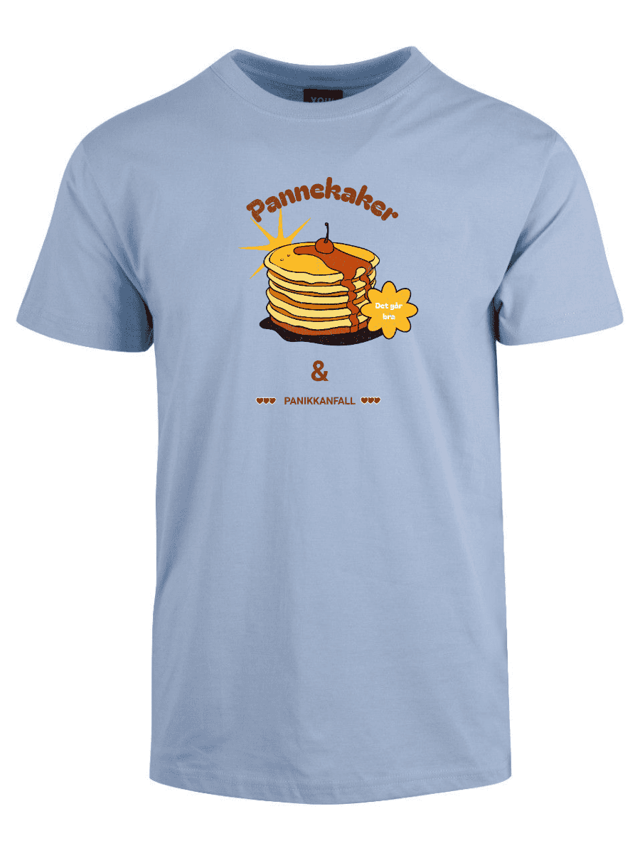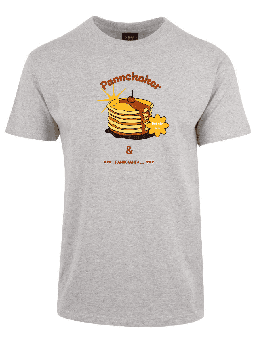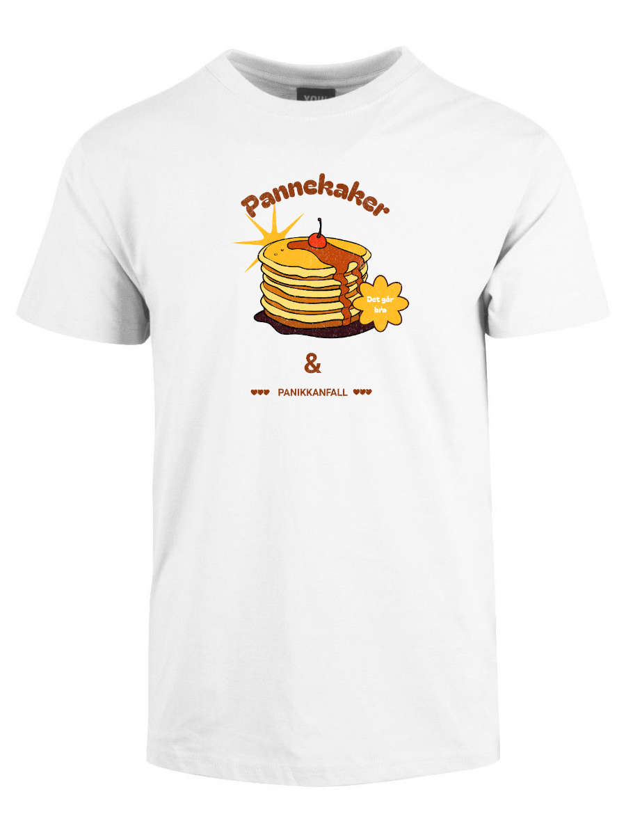 Pannekaker og panikkanfall. To ting som ofte kommer sammen, men sjelden snakkes om samtidig. Pannekaker og panikkanfall er t-skjorten som sier det høyt: mental helse er ikke alltid estetiske sitater og meditasjon. Noen ganger er det pannekaker klokka tre på natta og angst som ikke gir slipp.