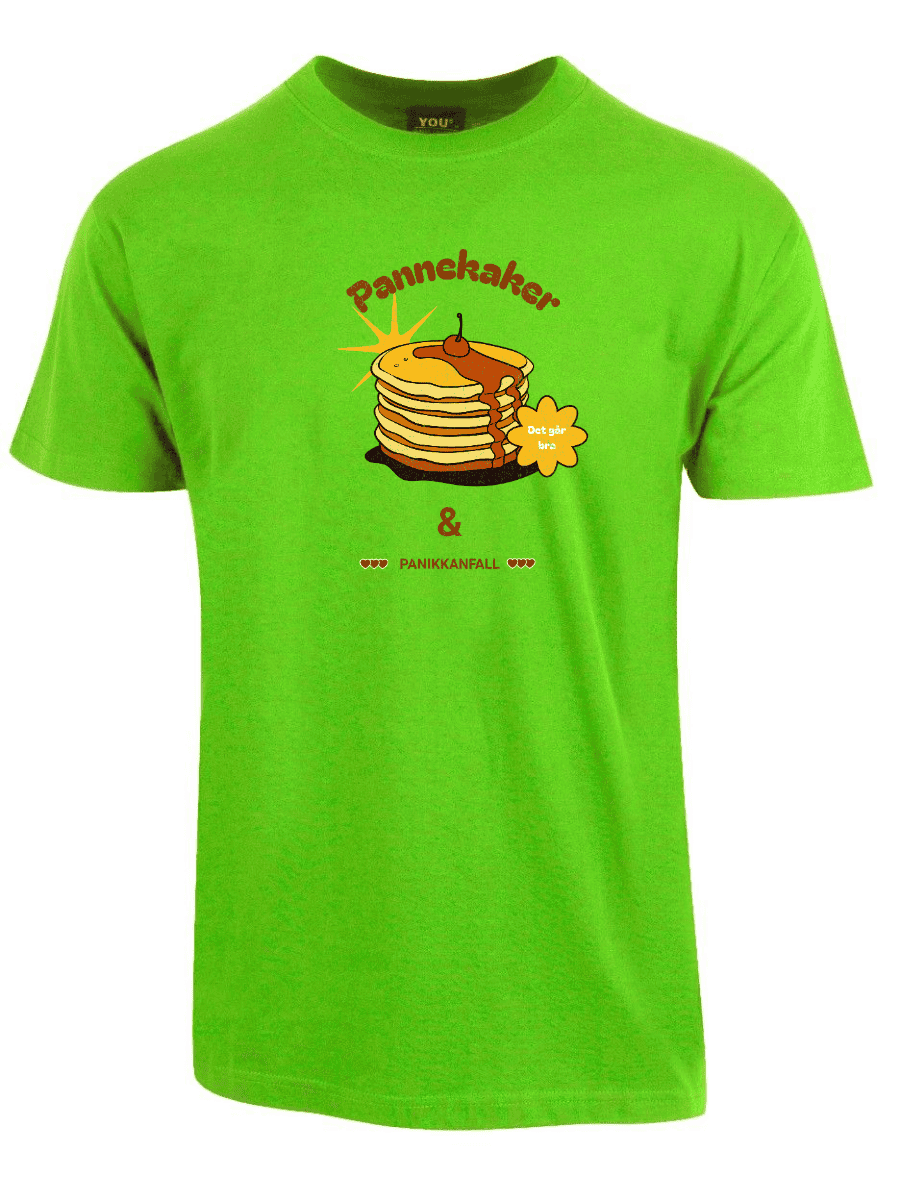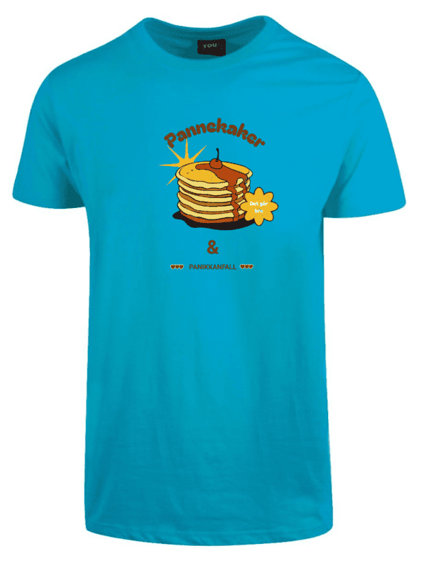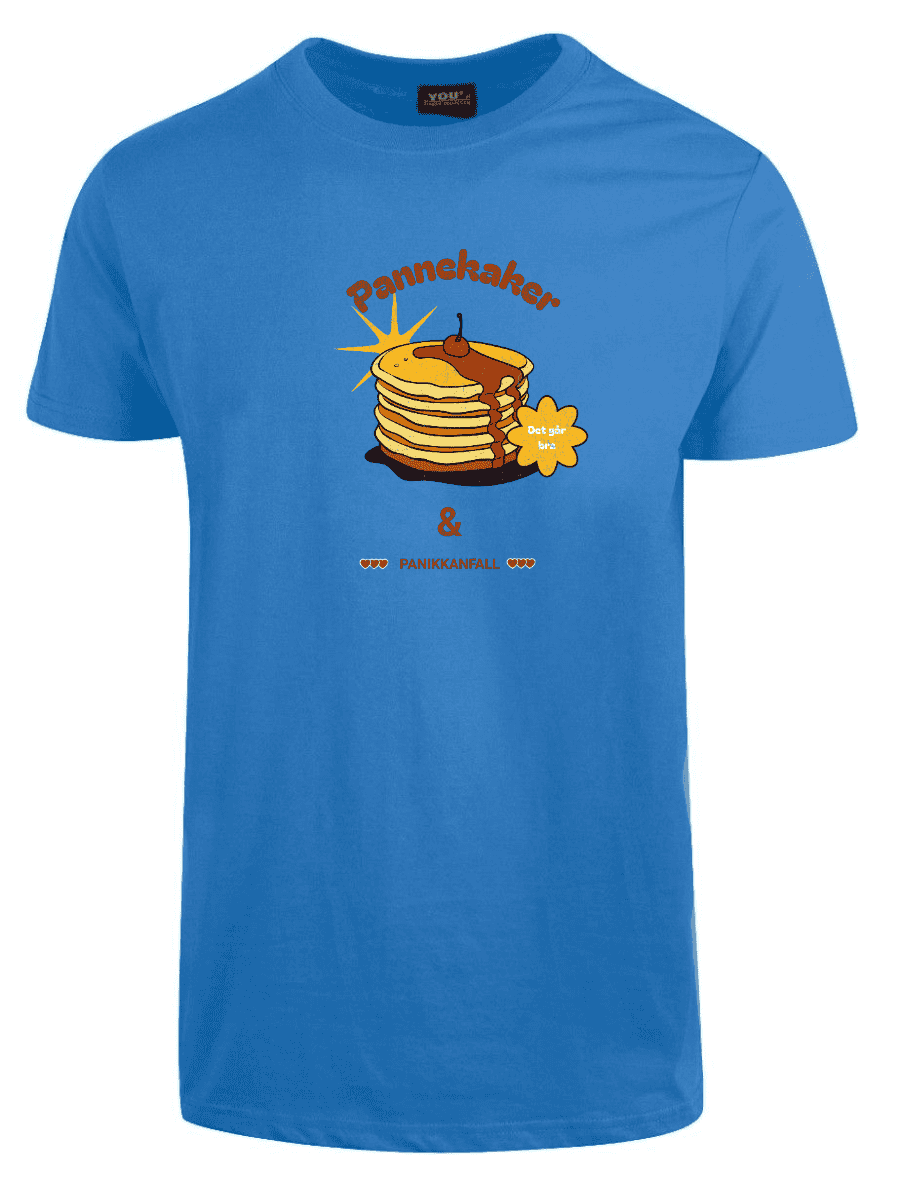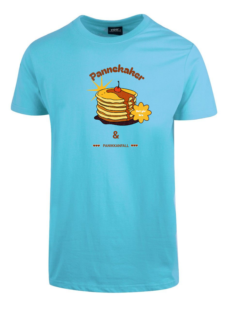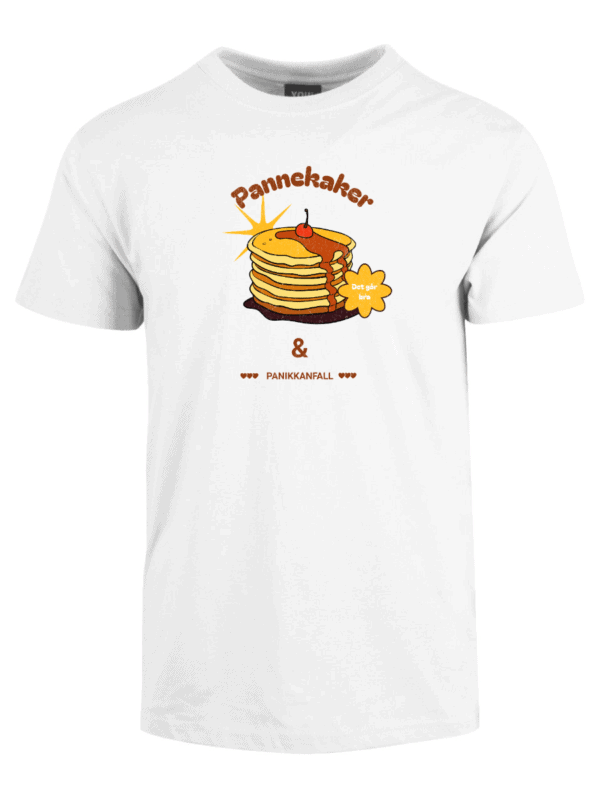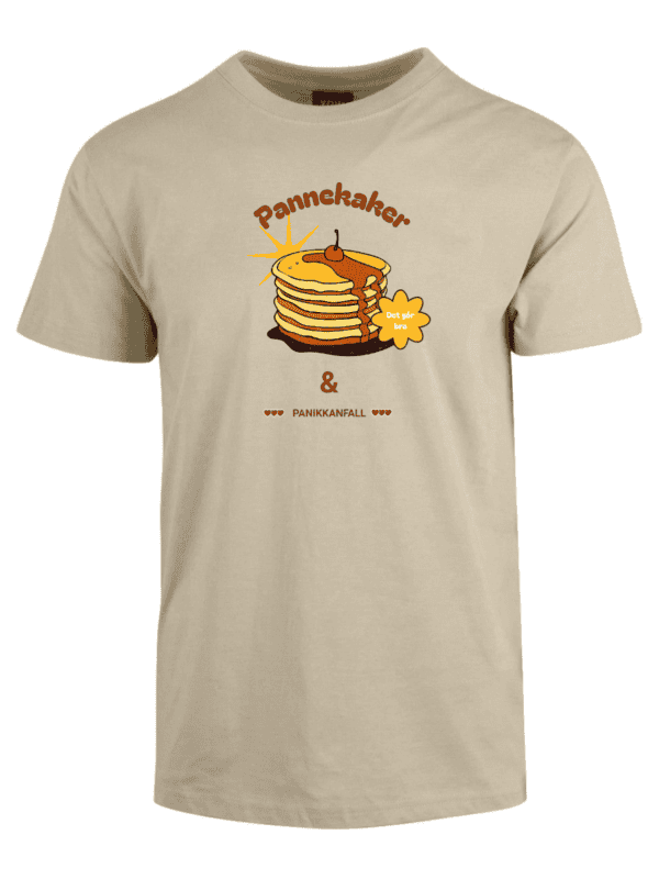 Pannekaker og panikkanfall. To ting som ofte kommer sammen, men sjelden snakkes om samtidig. Pannekaker og panikkanfall er t-skjorten som sier det høyt: mental helse er ikke alltid estetiske sitater og meditasjon. Noen ganger er det pannekaker klokka tre på natta og angst som ikke gir slipp.