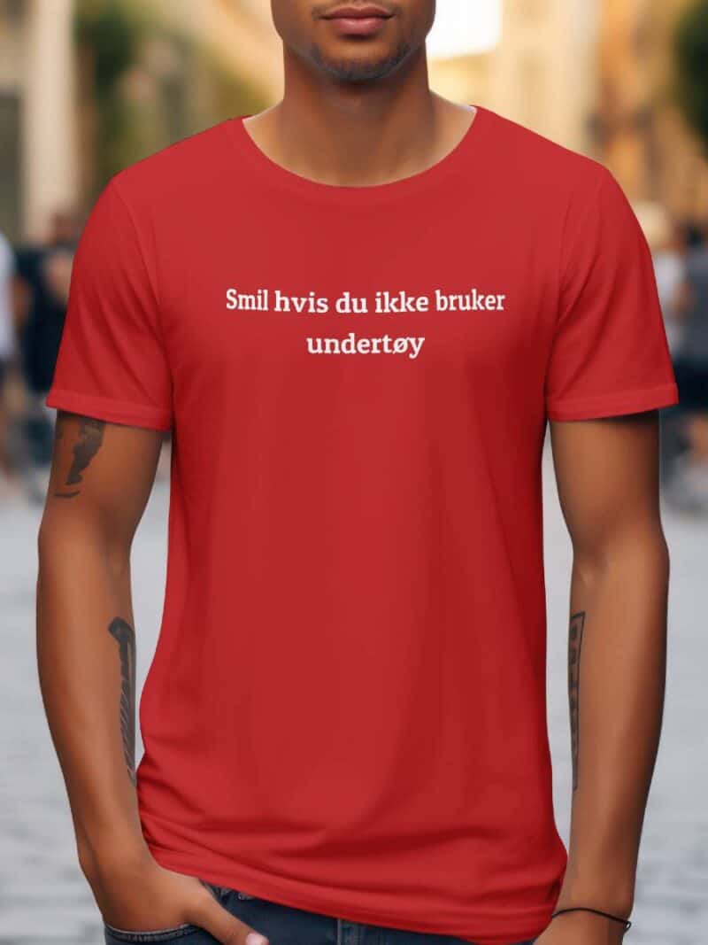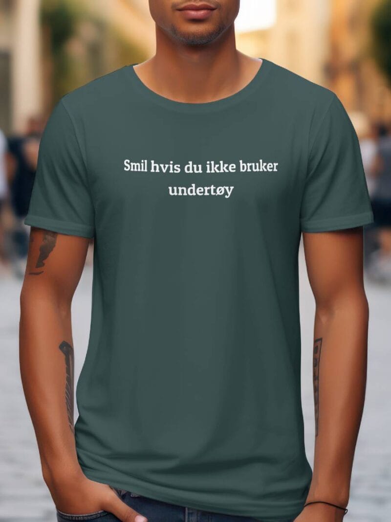Humoren i denne teksten fungerer fordi den inviterer til en spontan reaksjon. Folk som ser deg i T-skjorten, må nesten tenke seg om et øyeblikk – og mange ender opp med å smile. Når du går rundt i en T-skjorte som sier «Smil hvis du ikke bruker undertøy», er du garantert å få oppmerksomhet, latter og kanskje noen morsomme samtaler du ellers aldri ville hatt.