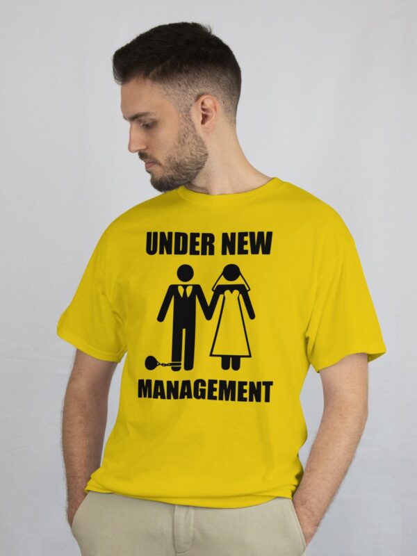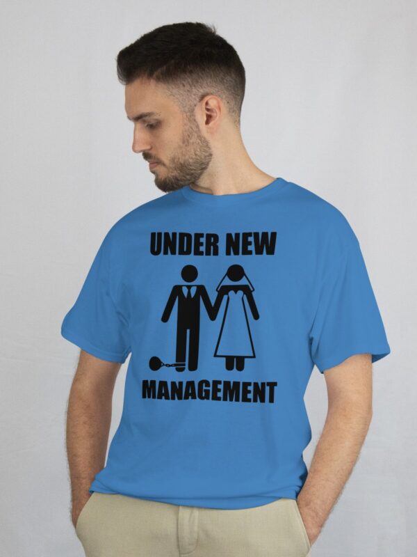 Denne Under new management T-skjorte er laget i myk, slitesterk bomull med trykk av høy kvalitet som tåler både latter, bryllup og skilsmisse. Passformen er unisex, og T-skjorten finnes i mange størrelser og farger – så både brud og brudgom kan finne sin match.