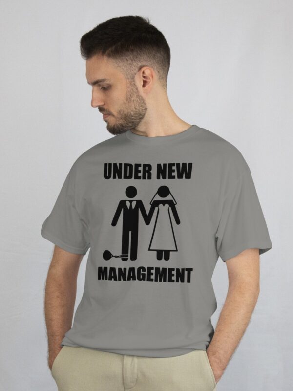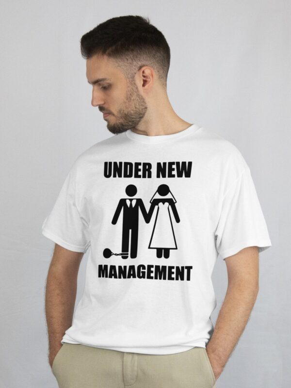 Når ringen er på plass og friheten er et fjernt minne – Under new management T-skjorte sier alt uten at du trenger å si et ord. Motivet viser et nygift par, der mannen har fått en klassisk kule og lenke festet til foten. Perfekt som gave til nygifte, utdrikningslag, eller bare som en ærlig advarsel til alle som vurderer ekteskap.