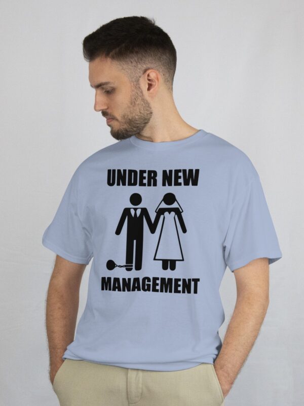 Nøkkelord: Under new management T-skjorte, morsom t-skjorte, bryllupsgave t-skjorte, utdrikningslag t-skjorte.