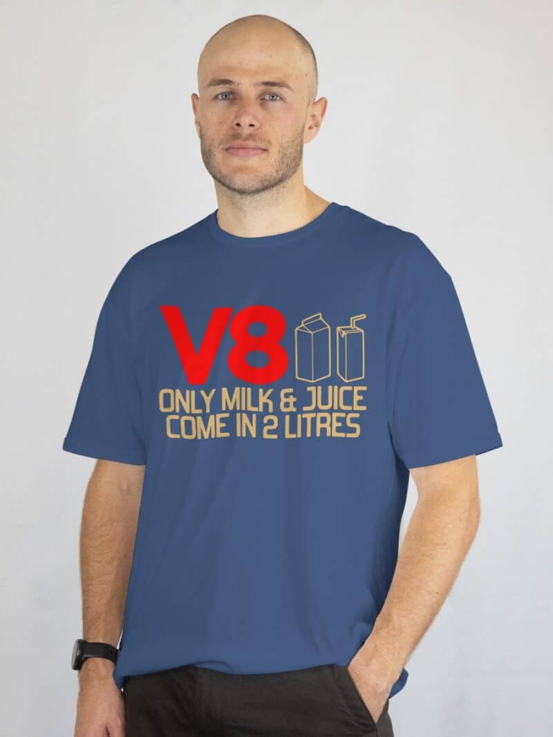 Nøkkelord: V8 Only milk and juice come in 2 litres T-skjorte, bil t-skjorte, motor t-skjorte, muskelbil t-skjorte.