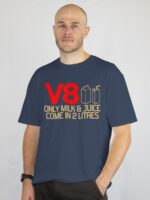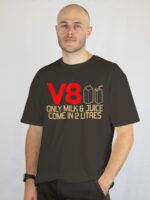 For ekte bensinhoder som vet forskjellen på lyd, kraft – og respekt. V8 Only milk and juice come in 2 litres T-skjorte er laget for deg som mener at alt under åtte sylindre er husholdningsvarer. Dette er T-skjorten for garasjen, biltreffet og søndagsturen med vind i håret og eksos i sjela.