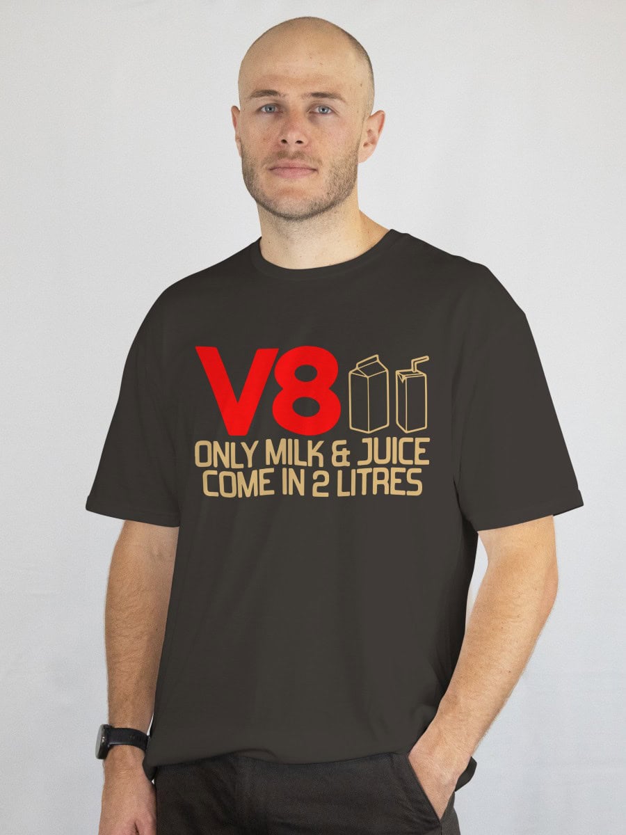 V8 Only milk and juice come in 2 litres T-skjorte – for ekte motorfolk, ikke melkedrikkere.