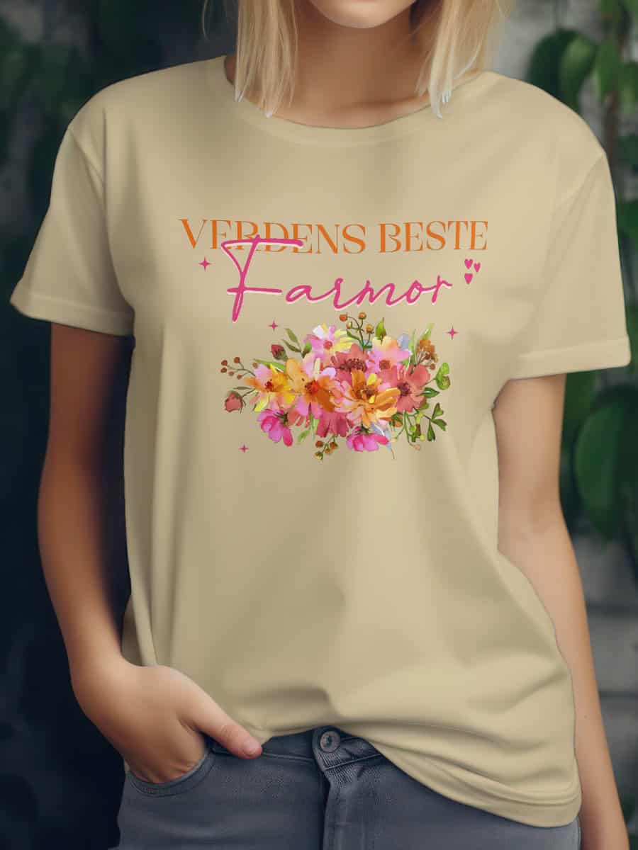 Denne Verdens beste farmor T-skjorte er laget i myk, slitesterk bomull som føles like god som et pledd og en kopp kakao hos farmor. Stoffet puster og sitter behagelig, og kvaliteten tåler både hagearbeid, kjøkkensjau og en god runde “hva vil du ha til middag?” Trykket er produsert med høy presisjon og kvalitet, slik at teksten holder seg klar og fin selv etter mange vask.